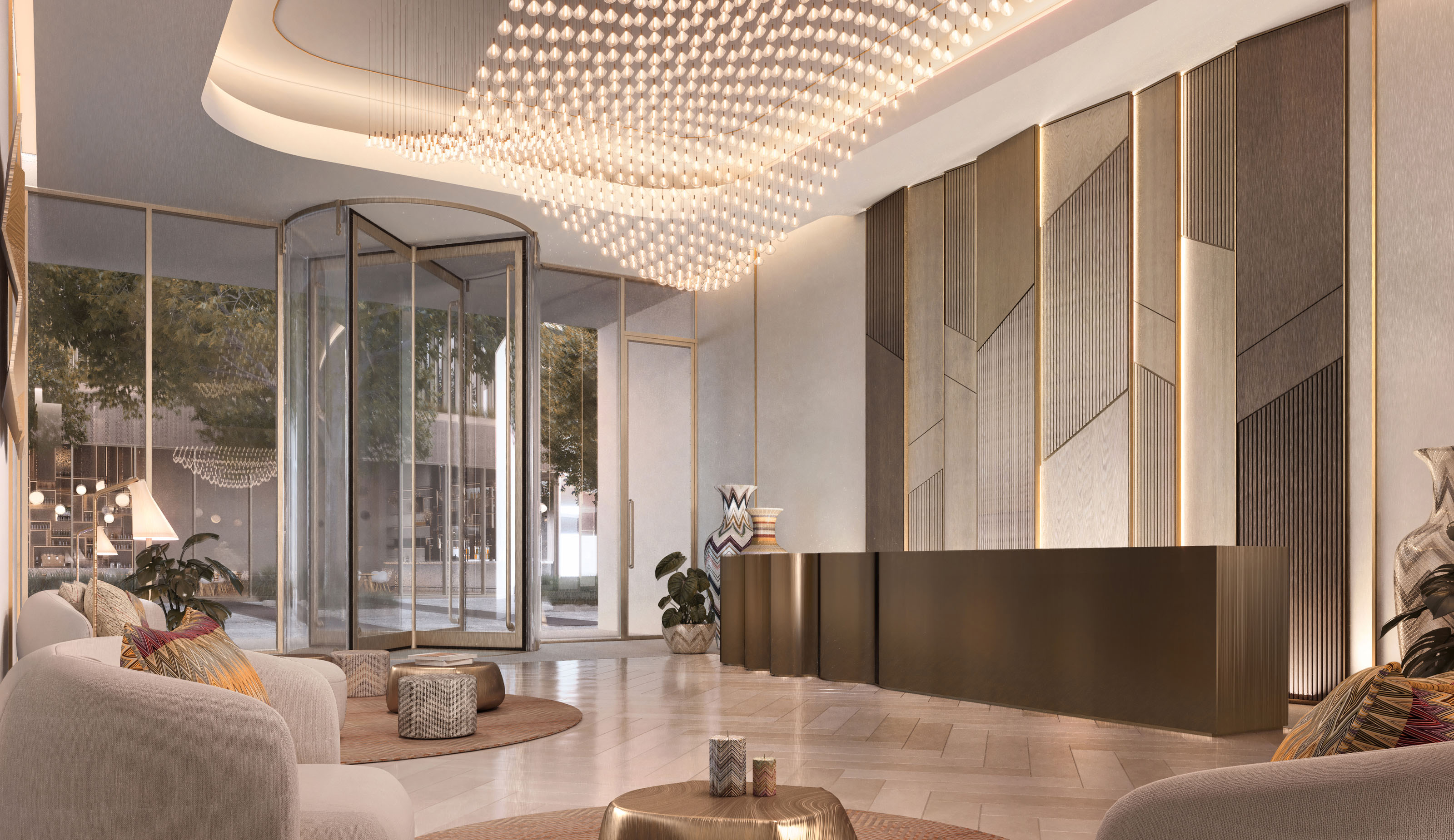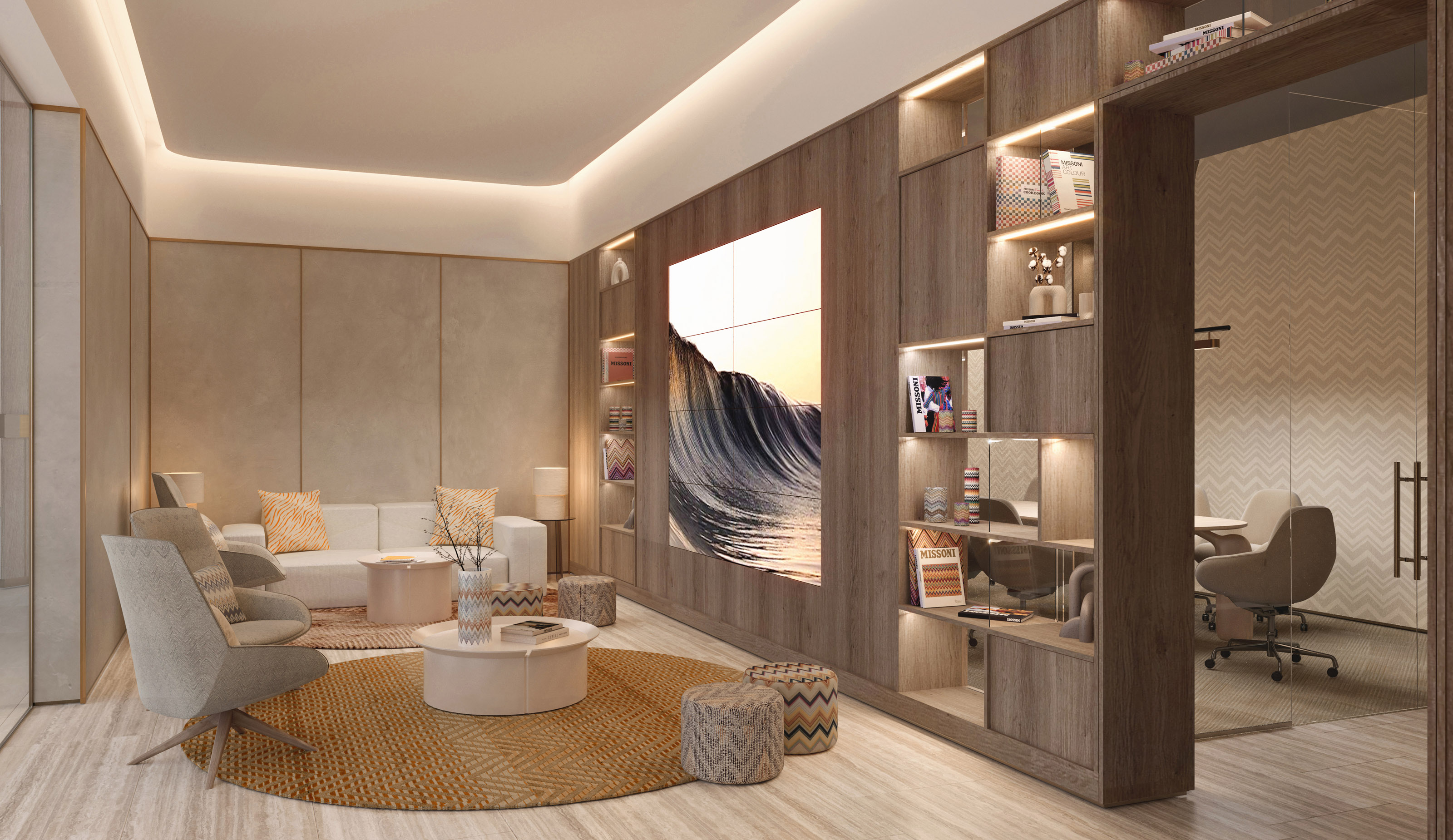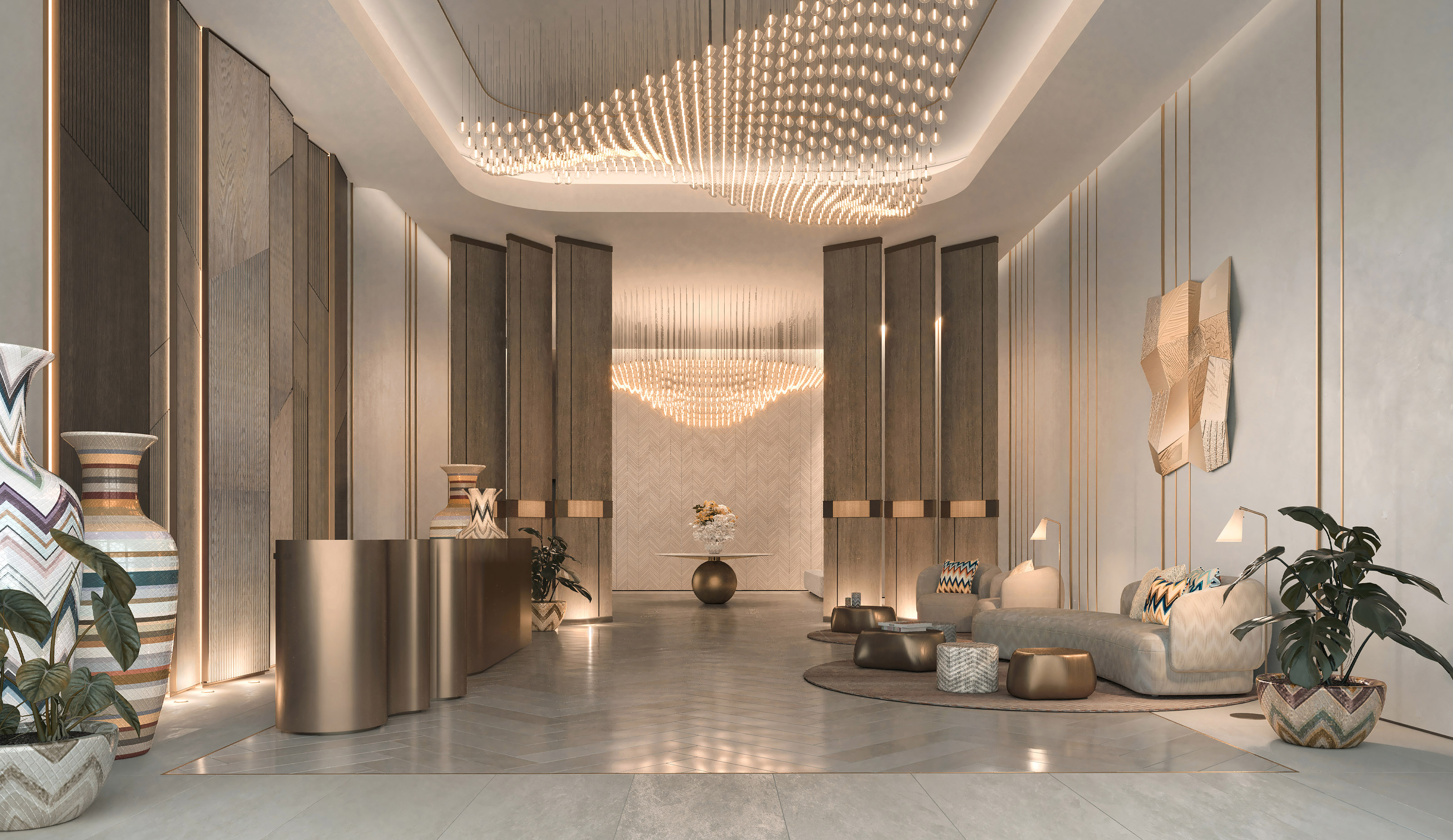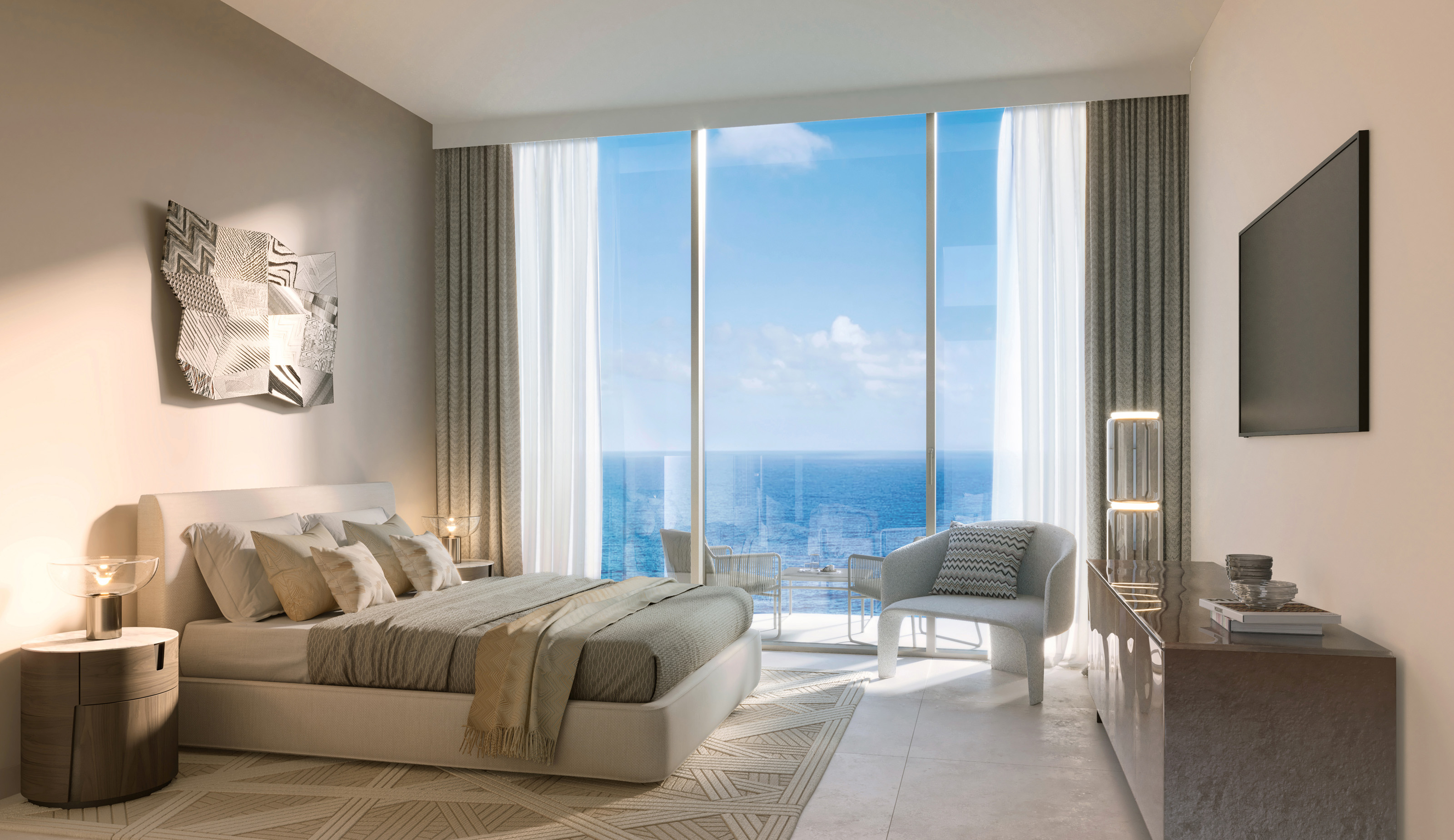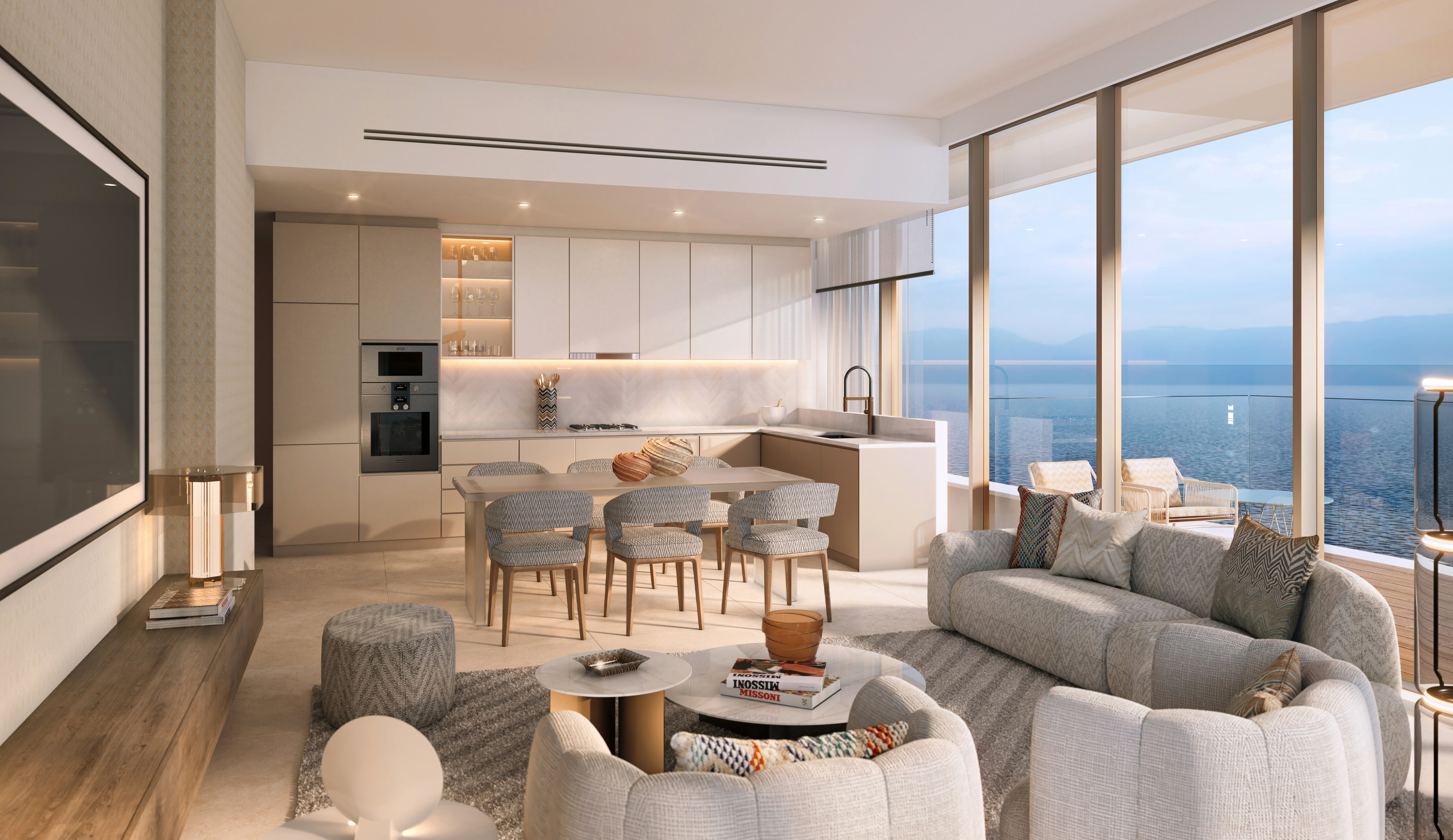Rich and vibrant fabrics with cheerful geometric patterns add a lively and dynamic touch to the design, contrasting beautifully with the clean lines of the furniture and architectural elements. High-end furniture integrates seamlessly with reflective finishes, bronze details, and soft lighting, enhancing the modern and refined ambiance. From elegant living spaces with floor-to-ceiling windows to serene bedrooms and thoughtfully designed bathrooms, every detail contributes to a cohesive and serene environment that reflects the beauty, vitality, and tranquility of the sea.