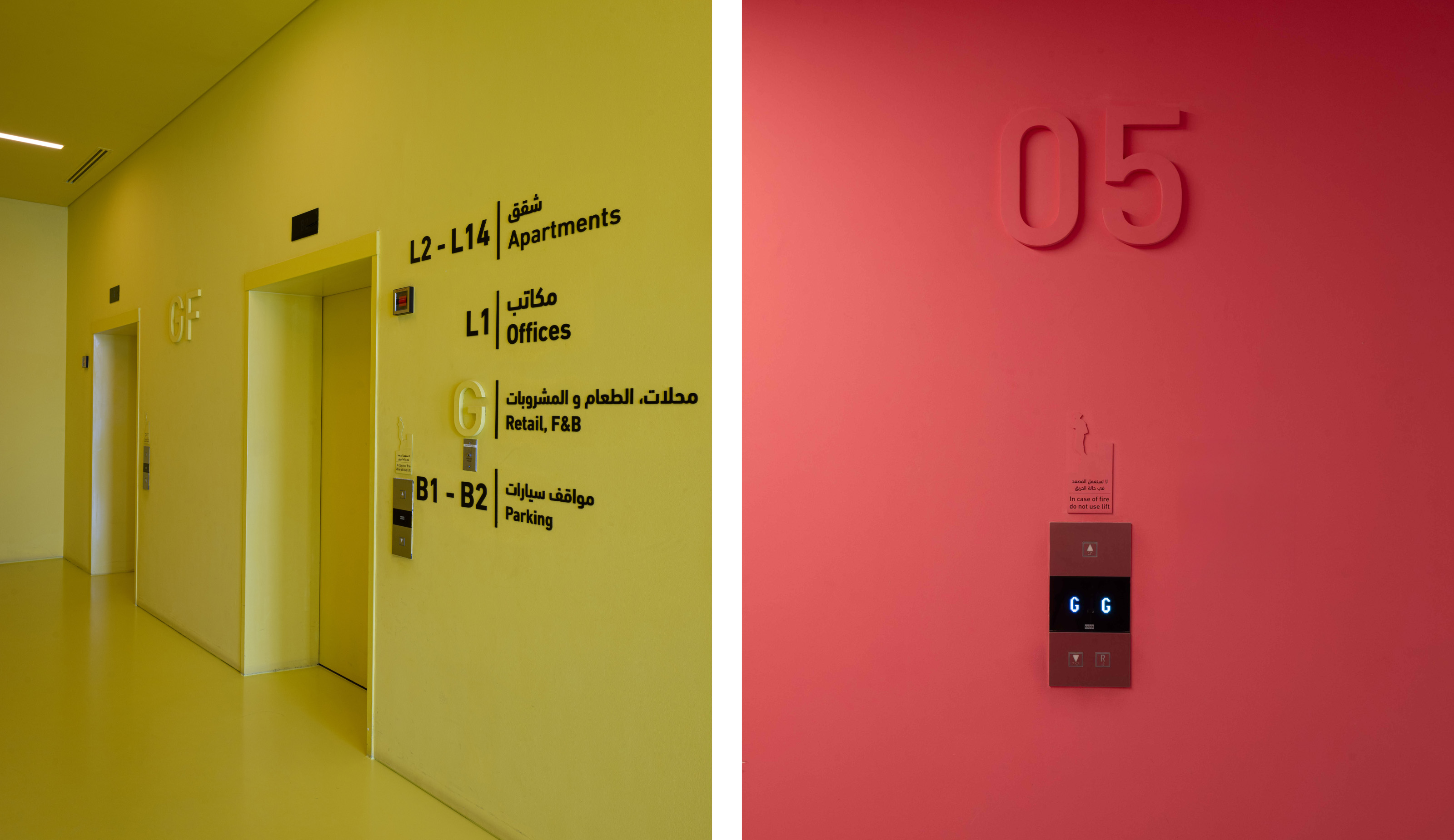 Each tower has been assigned a bright graffiti color: Olive bright green, Orange, Lavender, Jade, Ice Blue, Yellow, Perfect pink. Each color creates a certain atmosphere corresponding to the functions of the public places. For instance, the Makers Early Learning center is located in the Orange tower as orange colors increase creativity, happiness and joyousness whereas the Makers Clinic is situated in the Jade tower because indigo colors stimulate calmness and inner strength. The highlights in the interior design are related to the main components used by artists, such as light, color, shapes and textures.