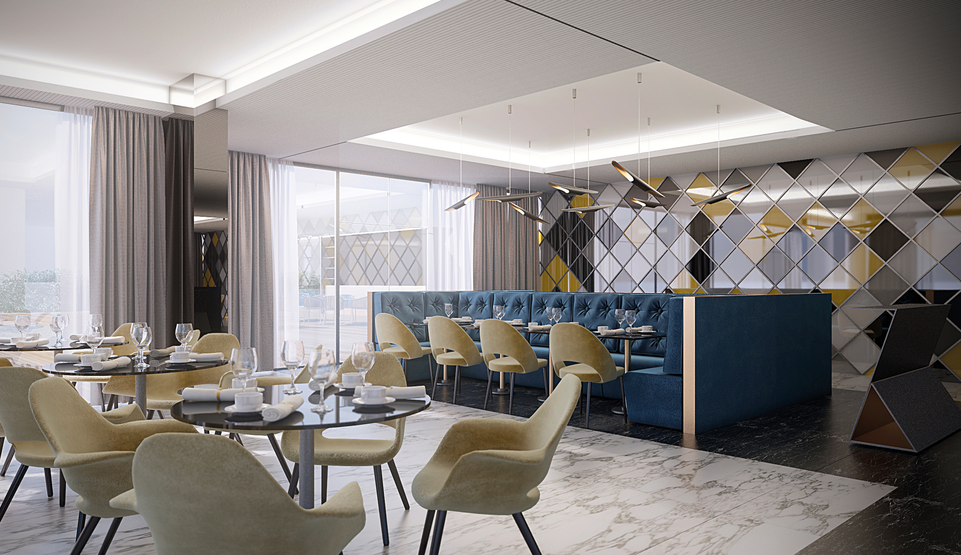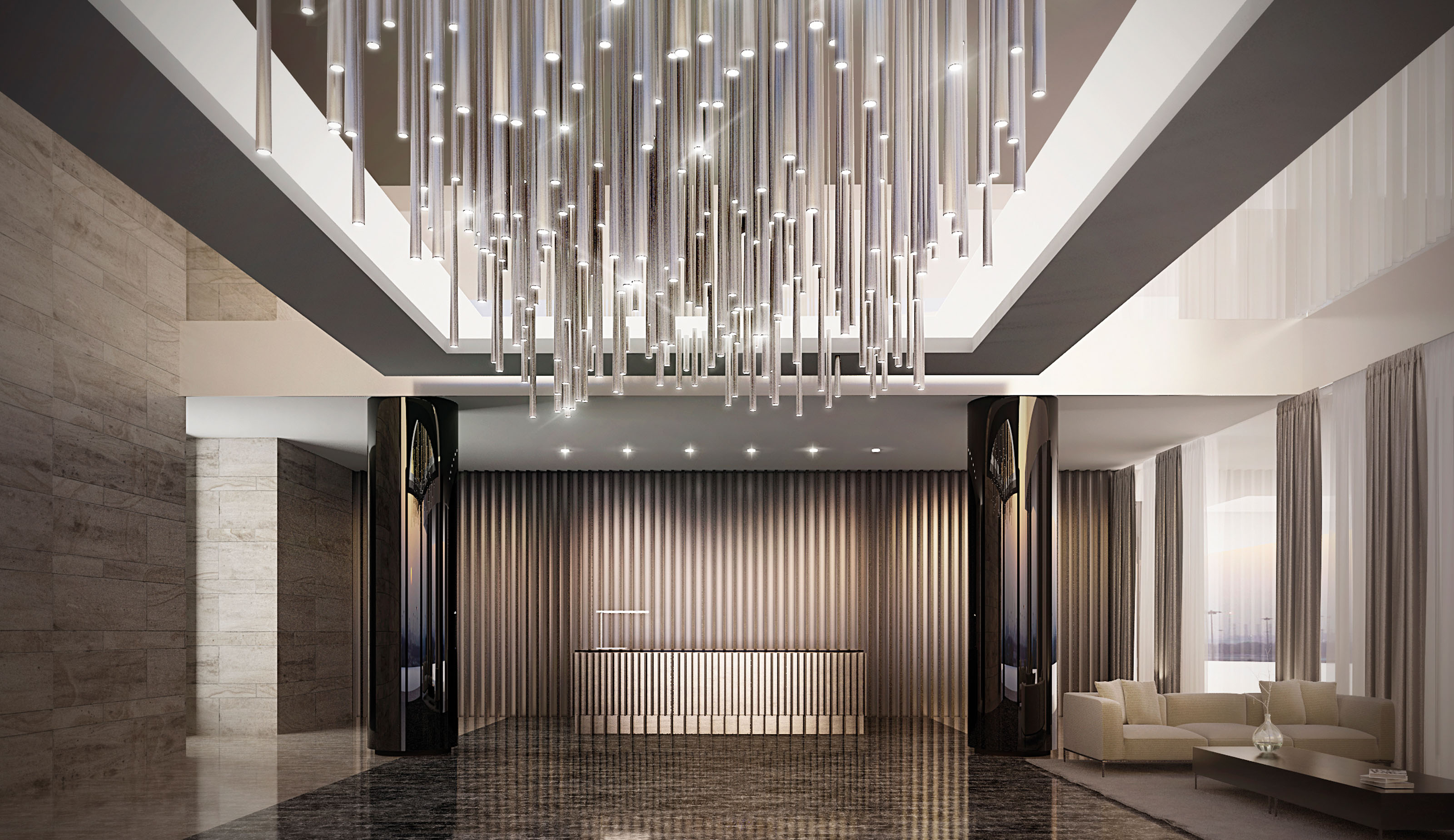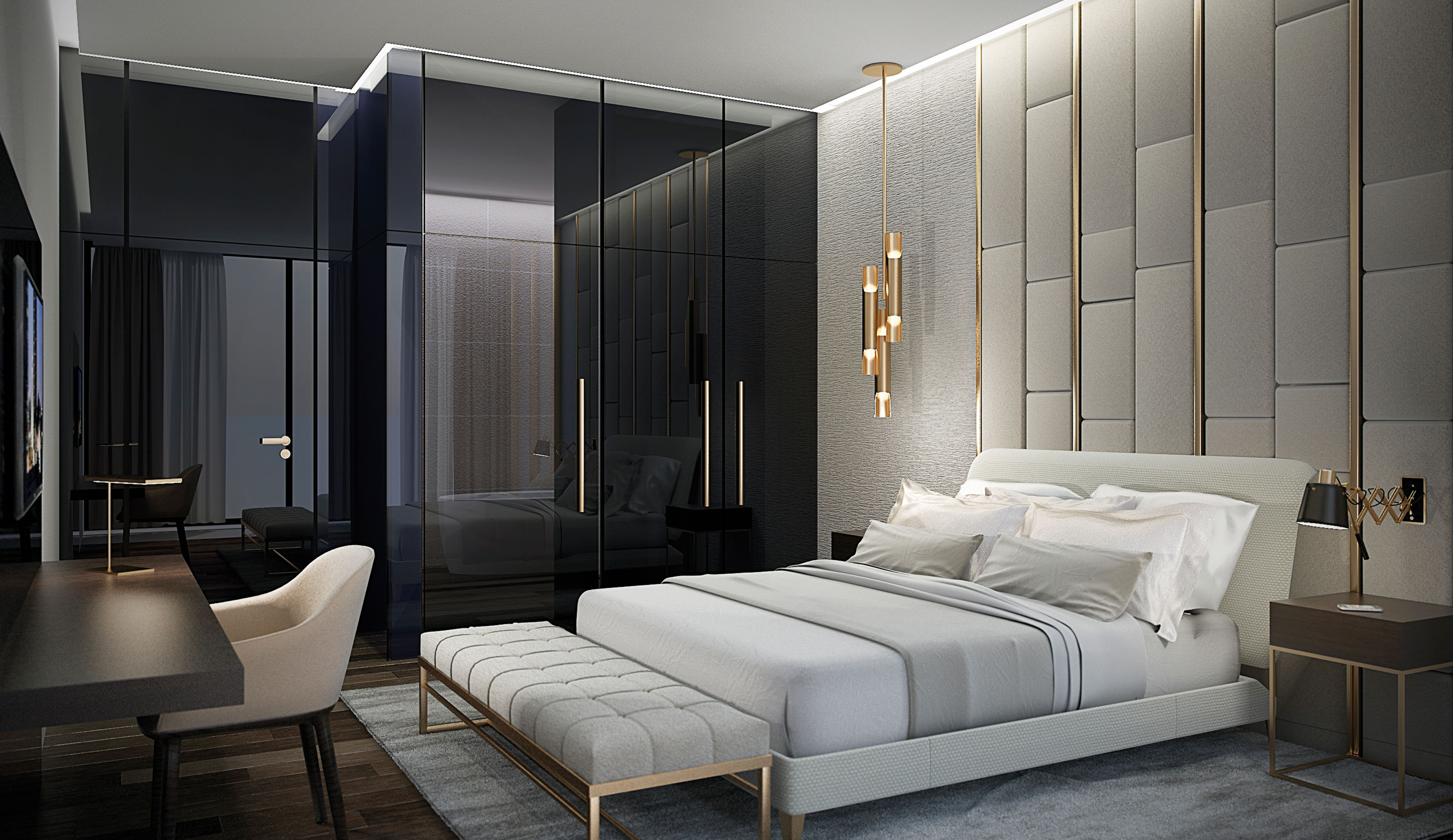 The lobby zone stands as a reference point for what guests will enjoy once they enter the rooms and apartments. A patterned marble flooring which seems to never end leads towards the reception desk, framed between two dark glass columns and cylindrical pendant lights which have a sculptural quality. The guest rooms replicate some of these features, like the lighting and the glass, adding touches of gold and a dimmer atmosphere to facilitate relaxation.