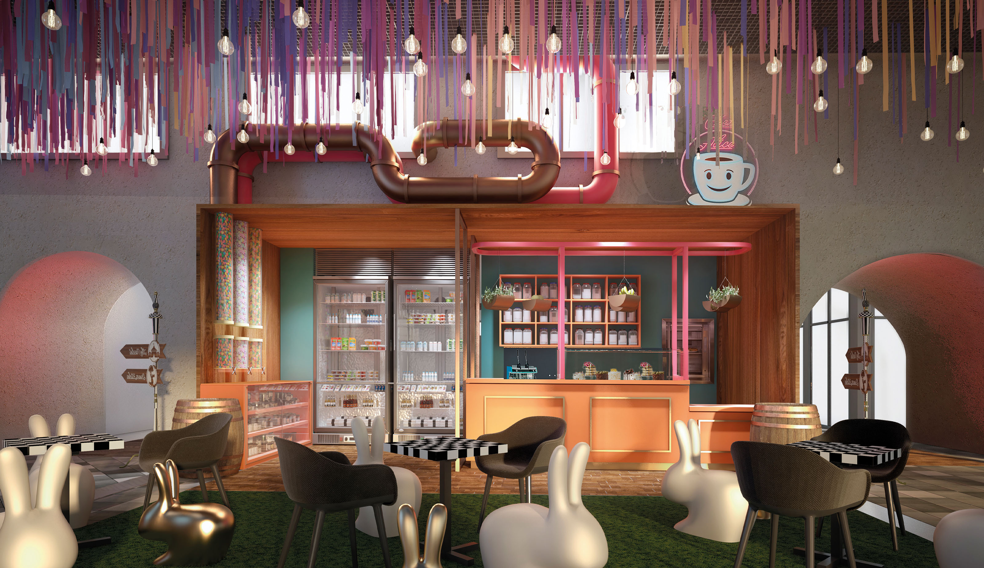 The “dream” features are achieved by several elements. The blue palette in the ceilings filled with candle-like pendant lamps resemble the light of the stars when we contemplate the sky at night, creating a sensation of awe. Hanging cages, lights hiding between nature-like decoration which is also suspended from the ceiling and the hedges which form natural space divisions, highlight the sensation of a magical garden.
