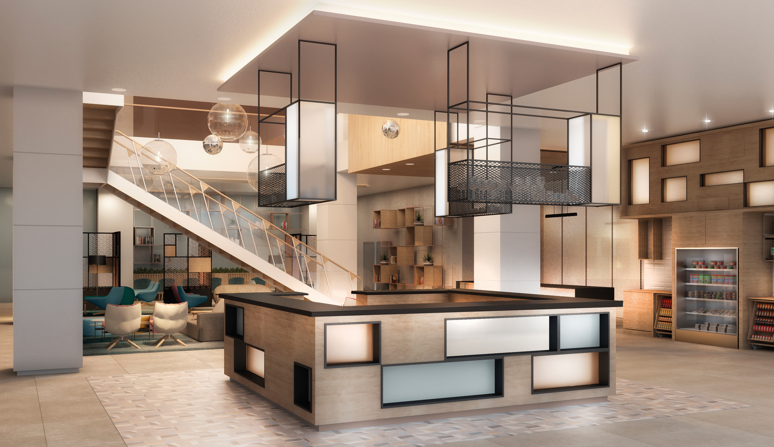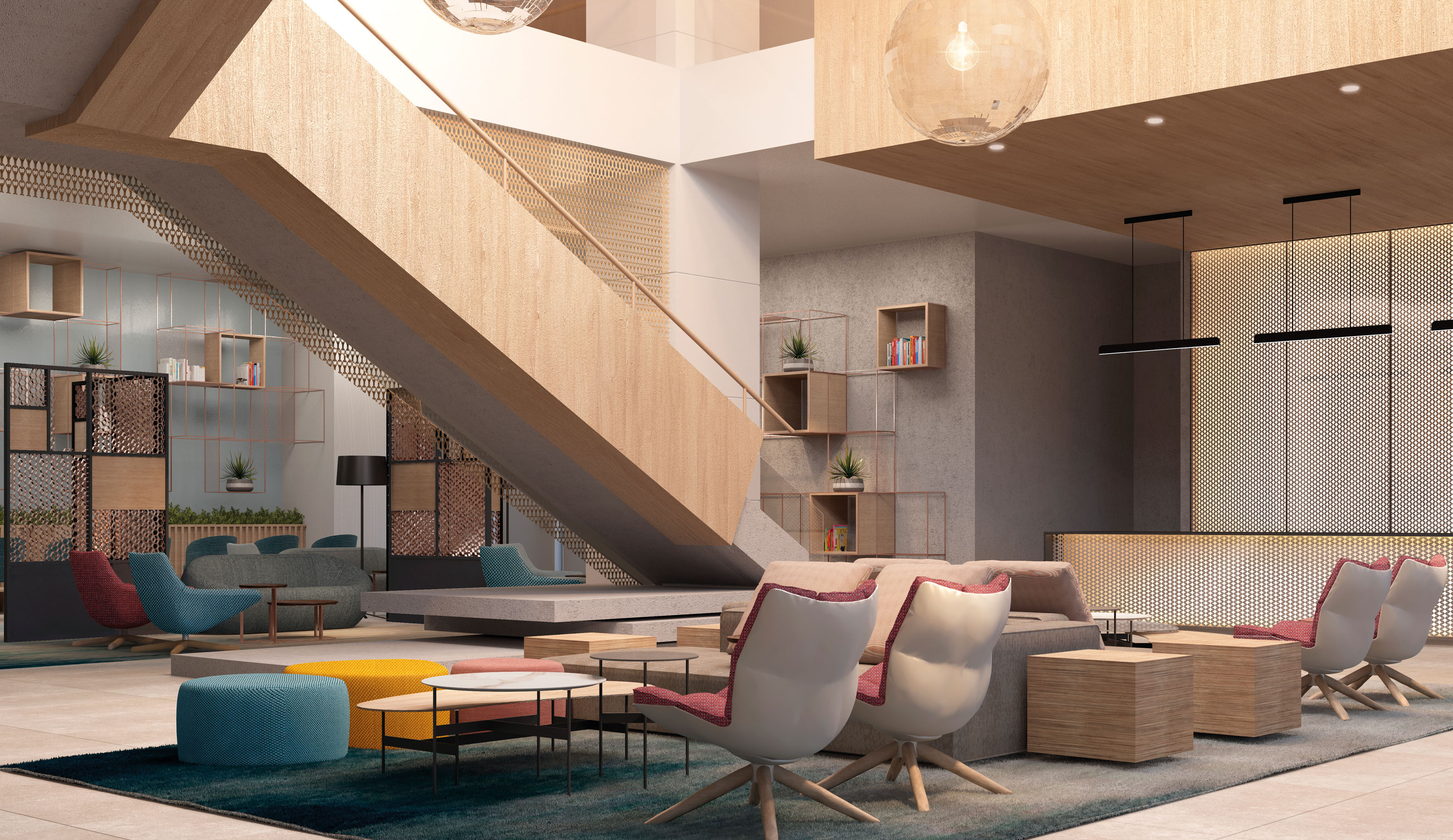 The main lobby engages the lines and shadows that is projected by the interior elements such as wood battens. The projection of the shadows creates an unique experience for the users of the space. The style has a modern twist that combines natural materials and colours inspired by natural stones. The furniture is fully upholstered with different pastel colors. The general ambiance evokes the feeling of home and comfort.