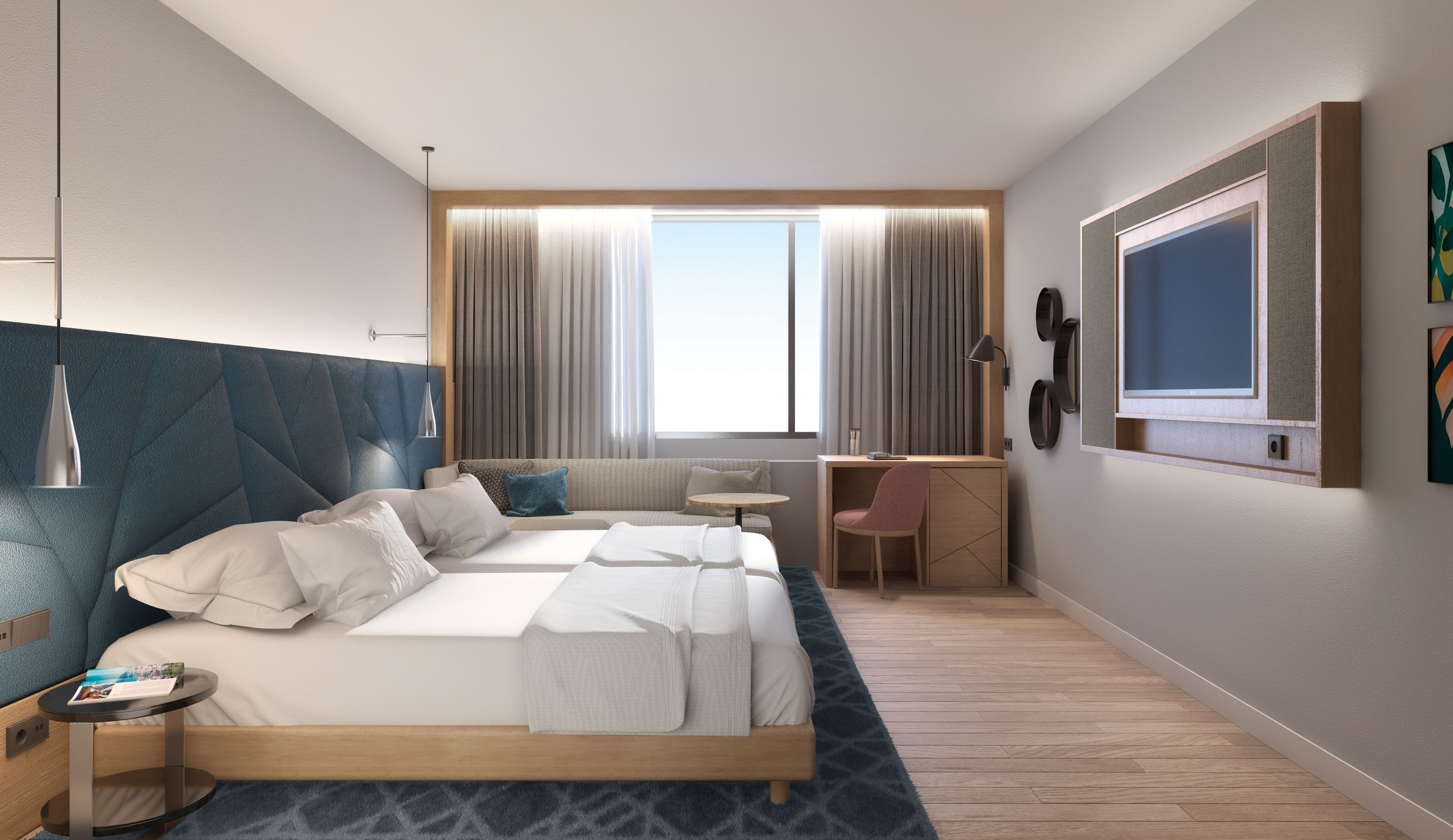 In the guestrooms accent wall of the room is in the upholstered headboard which has a bright colour fabric and diagonal lines as the project inspirational theme. The base of the bed is wood. However the general hues of the room are neutral colours to maintain a calm ambiance. The room is ornamented by mirrors and artwork distributed among the walls of the room. The bathroom has a wavy wall cladding imitating the water ripples.