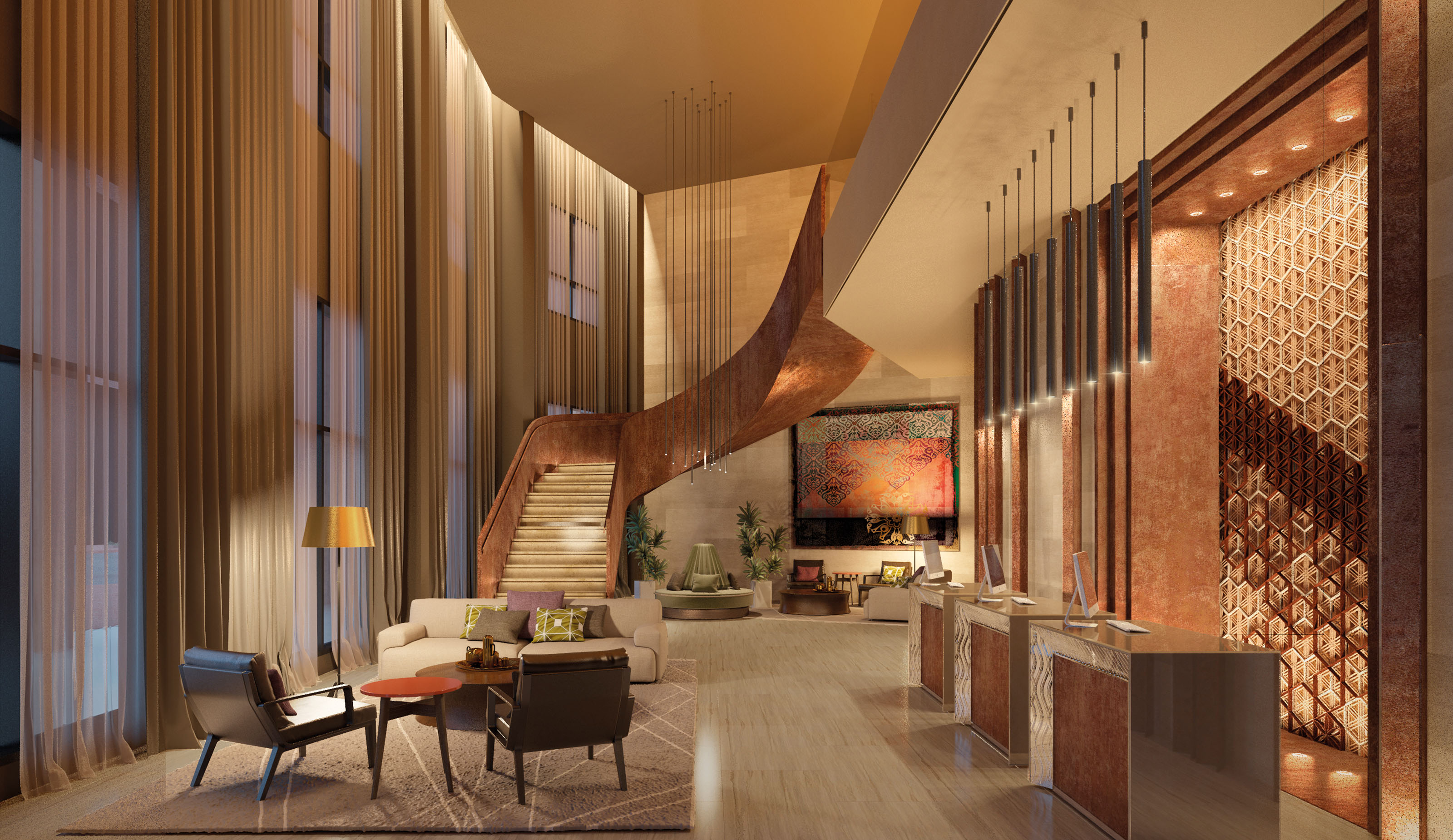 Following the operator’s philosophy of lavishing guests with a five-star stay and service, the Hotel Grand Millennium Madinah portrays this luxurious experience combined with the fact that the city of Madinah is a major pilgrimage site, as it stands as the second holiest place in Islam. Thus, a welcoming reception is highlighted together with the reinterpretation of local attributes through the design and materials.