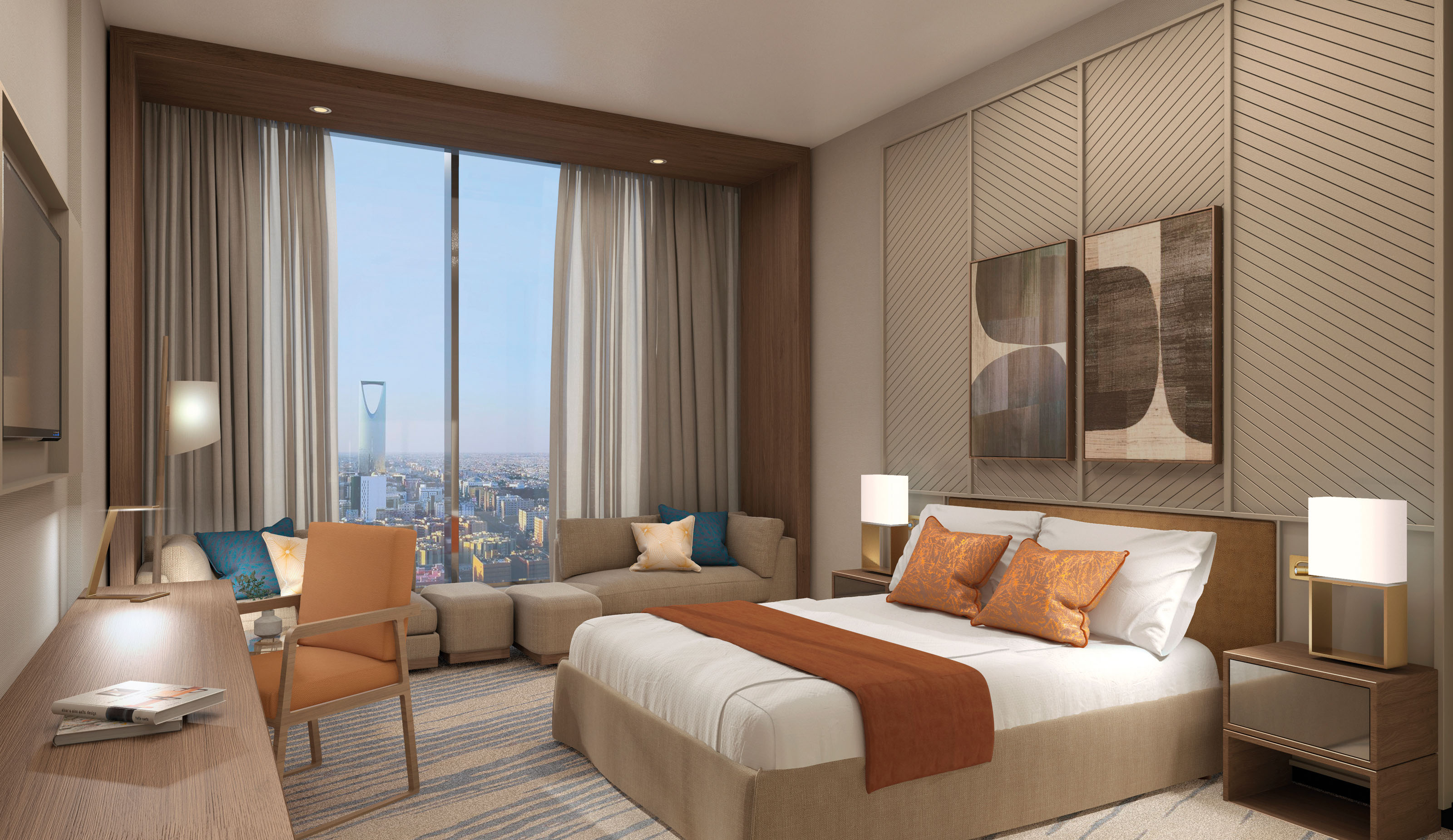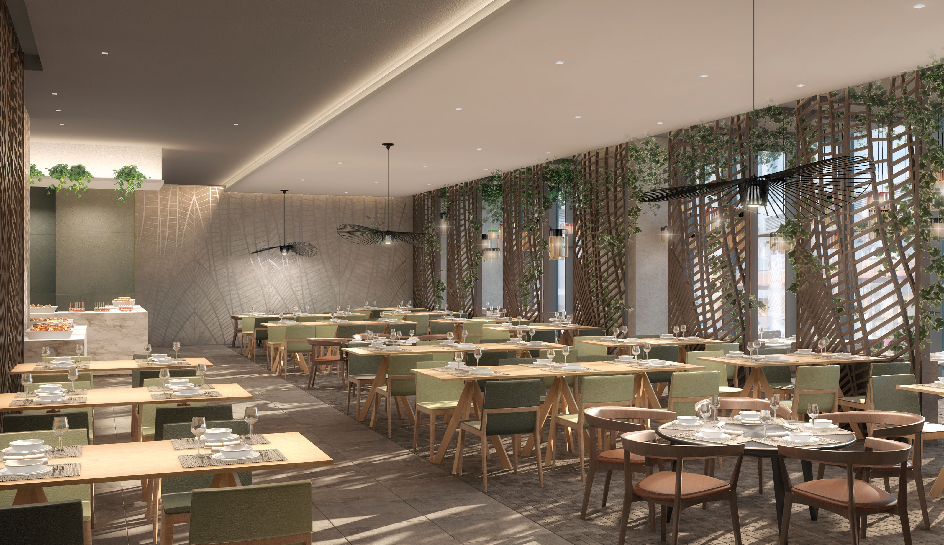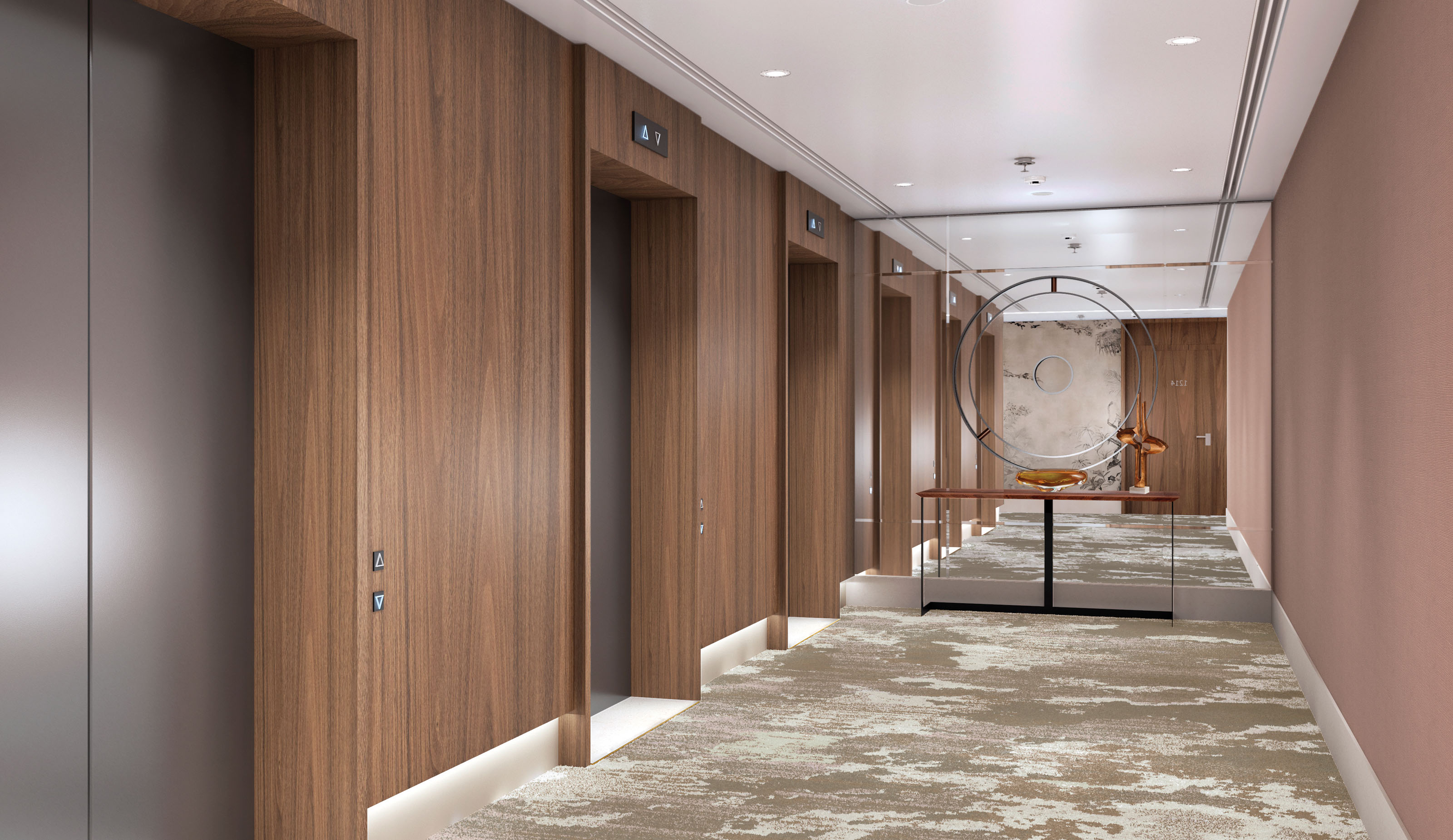 The atmosphere of the hotel feels like entering a peaceful oasis. The guests are welcomed with a long central water feature that mimics a mirage in a desert, with the reflection of a chandelier that looks like sand dune contours. Some geometric patterns on furniture, mosaic tiles and carpets make a subtle reference to the local identity and its Nature.