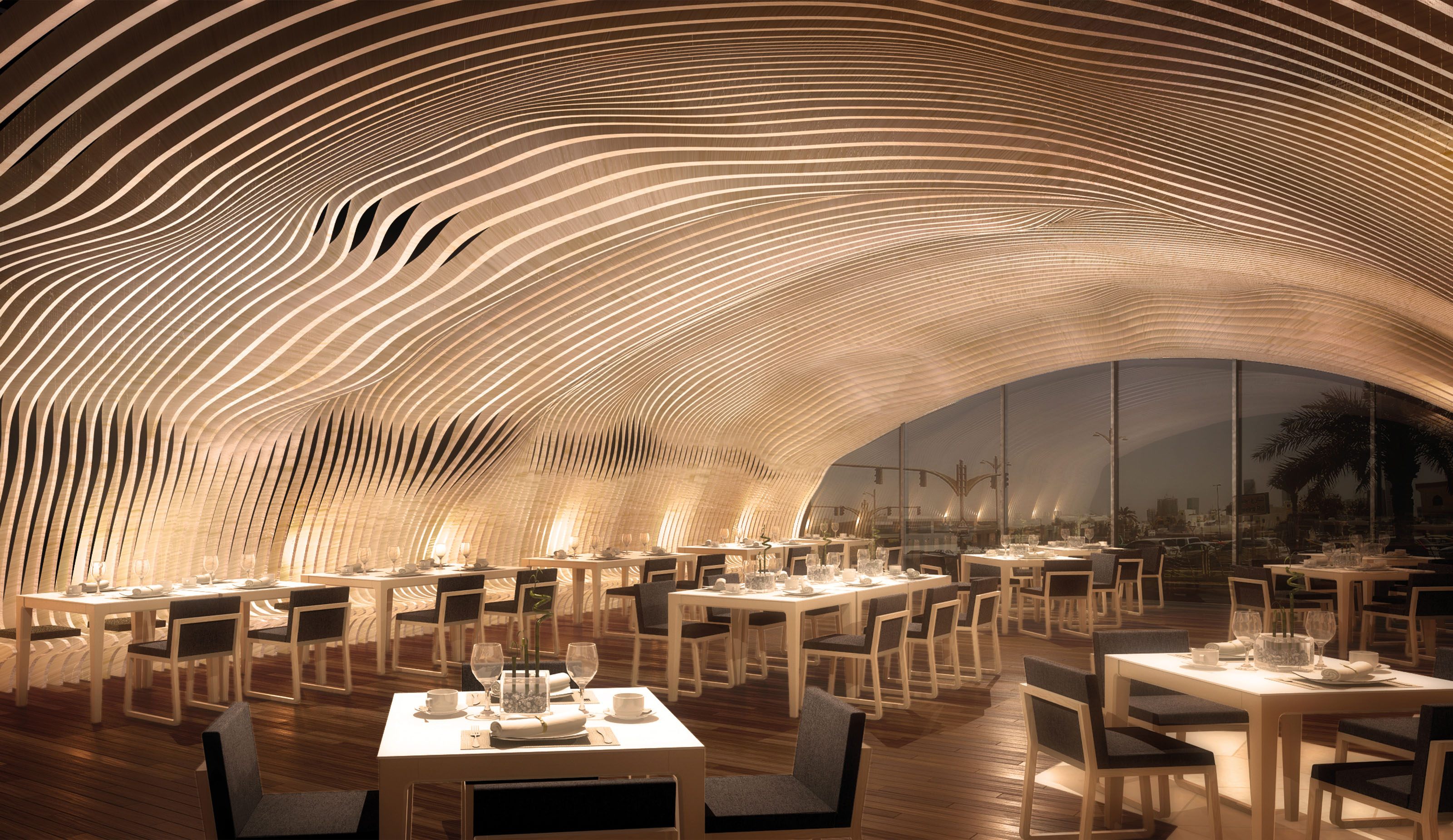 On the restaurant, for example, it strengthens the feeling of intimacy by using it as an ondular structure across the ceiling, forming a spectacular cavernous effect of shadows and lights. A similar and elegant execution takes place in the cafeteria, where wood intertwines to generate a sculptural effect. Other materials form an interesting juxtaposition, like the organically-shaped furniture in the cafeteria or the strips of white walls and lights of the meeting rooms. Overall, the interior design expresses the potential and beauty materials have -in particular wood- to create unique and mesmerizing environments without forgetting its practical applications.