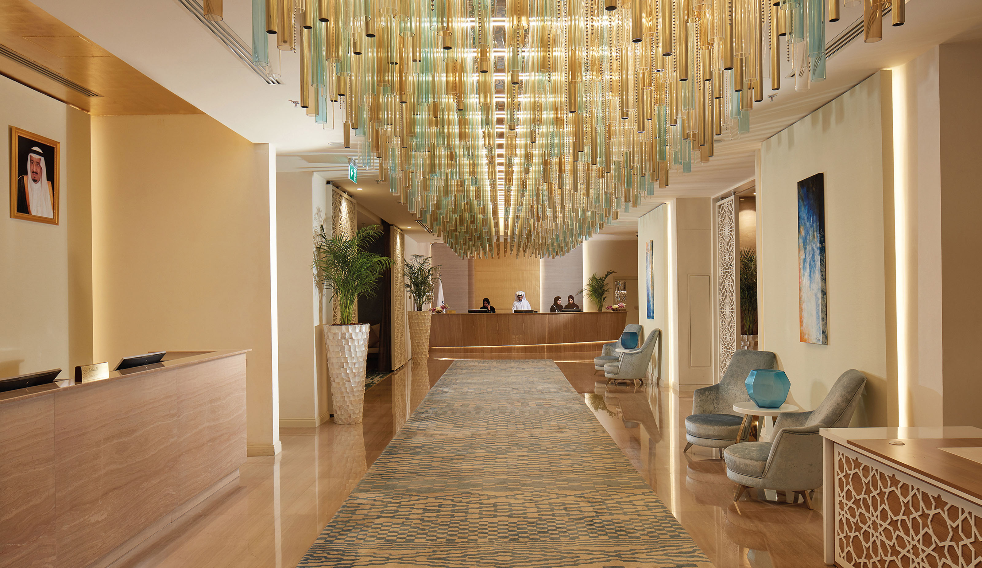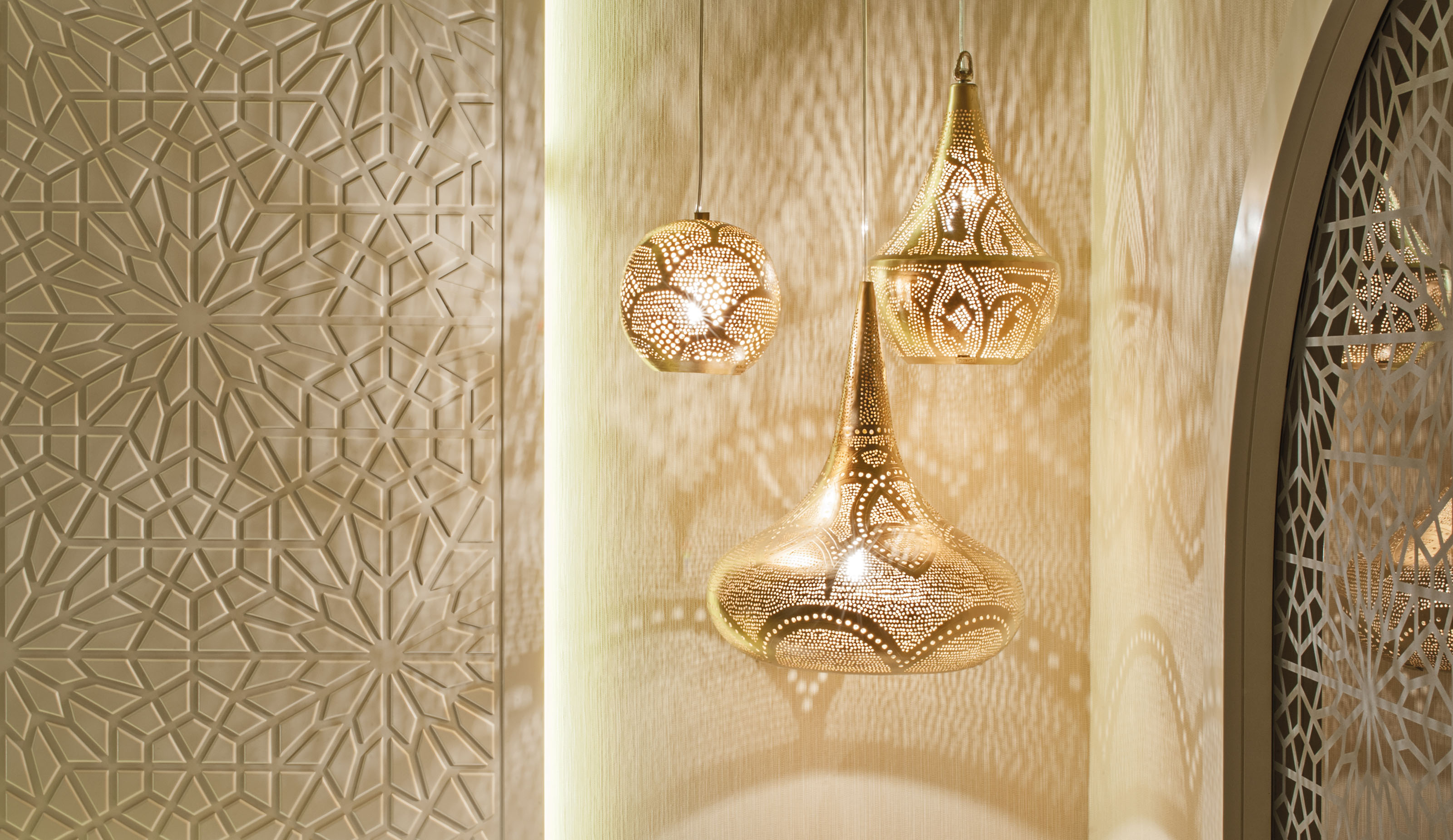 Peace and calmness are the main inspirations to develop the interiors of the spaces, both felt inserted within the atmosphere while welcoming its guests. The hotel, with 251 guest rooms follows a color narrative of cream and aqua palettes is followed throughout the inner spaces, two calming and muted hues which provide the necessary frame of mind to favor contemplation and serenity. Art, calligraphy, furniture and locally inspired motifs in rugs and lattices reinforce the sense of place, strengthen by the use of lights which multiply these Arabic patterns in walls, floors and ceilings to provide a natural continuity in the peaceful mood of the visitors to one of the world’s most venerated spots.