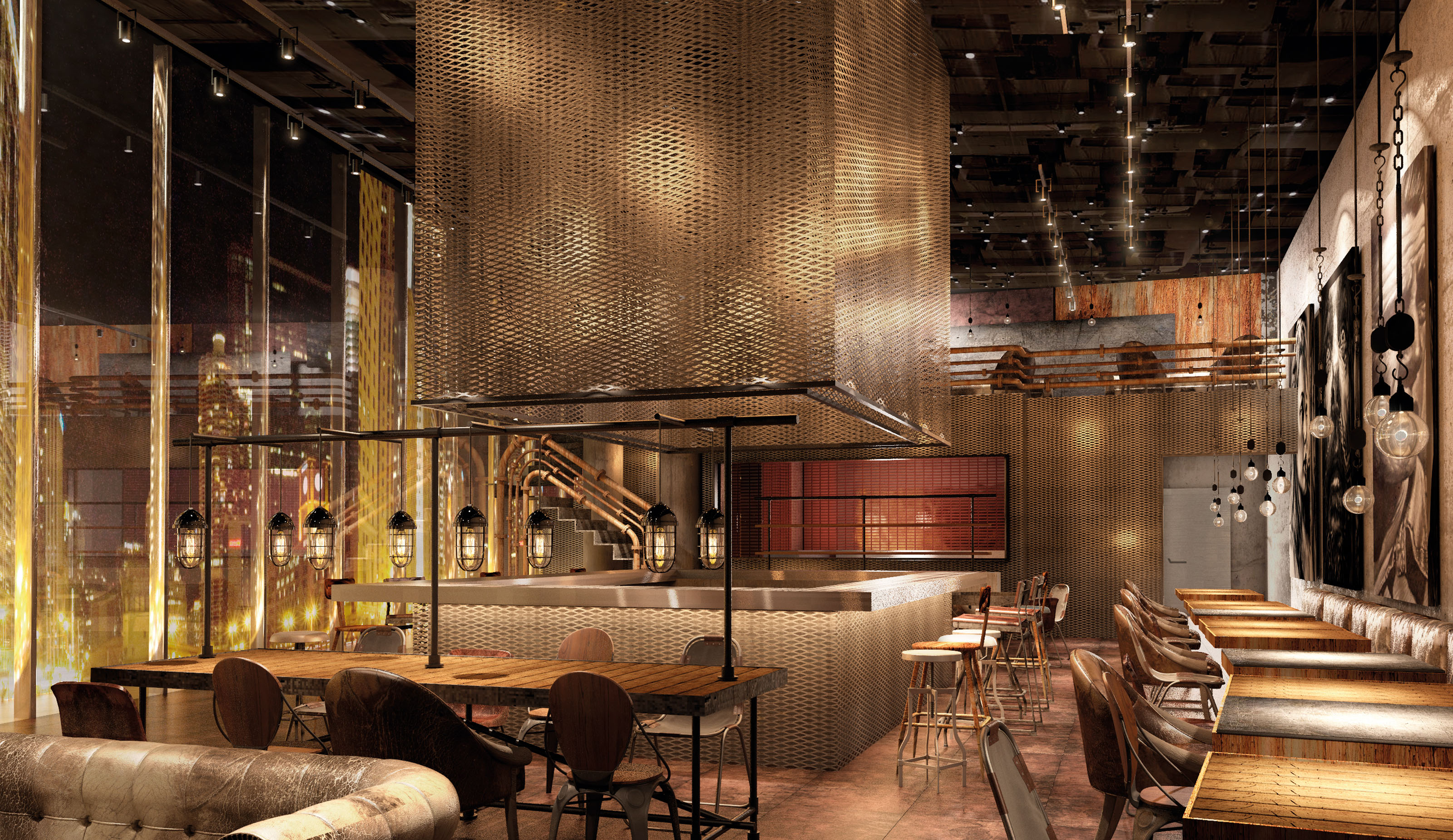 The use of pipes, concrete, exposed installations, metal mesh and plates, vintage furniture and lighting mark the industrial-vintage style of the place. Another key element in the decoration is the graphics, Stefano Alcantara’s paintings / photo impressions with their size and content.
