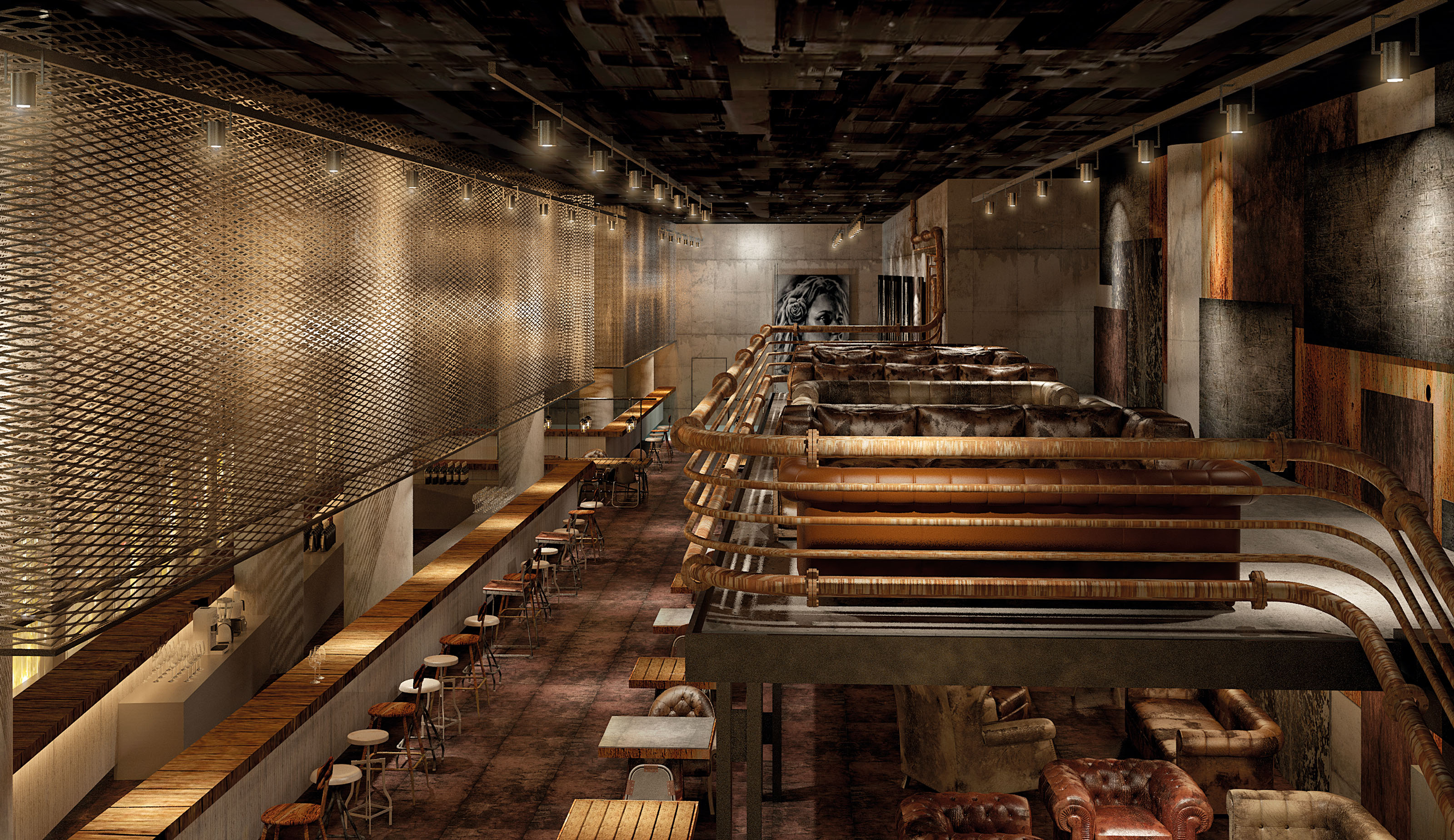 A long corridor divides the bars from the table area where lounge areas and tables of different types are mixed. The mezzanine with its peculiar pipe railing allows the creation of a VIP area on the upper floor and a more secluded area in the area below.