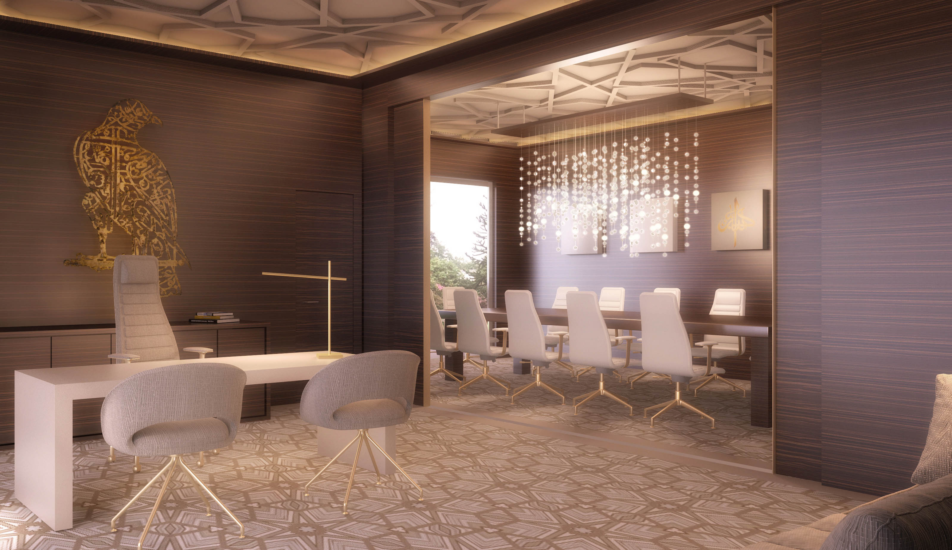 Arab patterns are found throughout. Wooden lattices in the main lobby span a few meters up to provide a decorative box complemented by the geometries on the stone floor and the jewelry-like pendant lights. The Majlis, a space for reunion and debate, is arranged around a circular ceiling which is the source of illumination, originated by sculptural-shaped lights which descend from the geometrical ceiling. Overall, the interior design strives to spotlight the cultural and commercial pride the Chamber of Commerce wants to transmit to its members when representing them and their industries regionally and internationally.