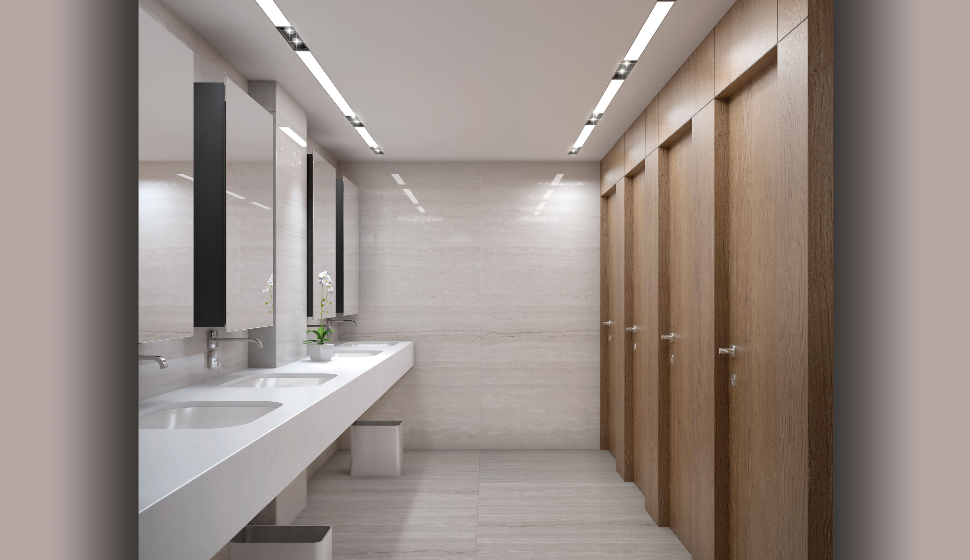 The reception and lobby areas act as the first point of contact for employees and visitors to the building. Thus, a warm welcome is highlighted by a wide space where stone and wood create a natural palette of textures and hues. The space is furnished with a seating area suitable to host meetings or to perform a role as a comfortable waiting room. The whole area is cleverly lit with integrated modular lighting on the ceiling combined with sculptural and geometrical lights which break the horizontal and vertical lines of the lobby. The same design language is applied in the access control and public toilets areas, highlighting the cohesiveness and welcoming spirit of the public areas.