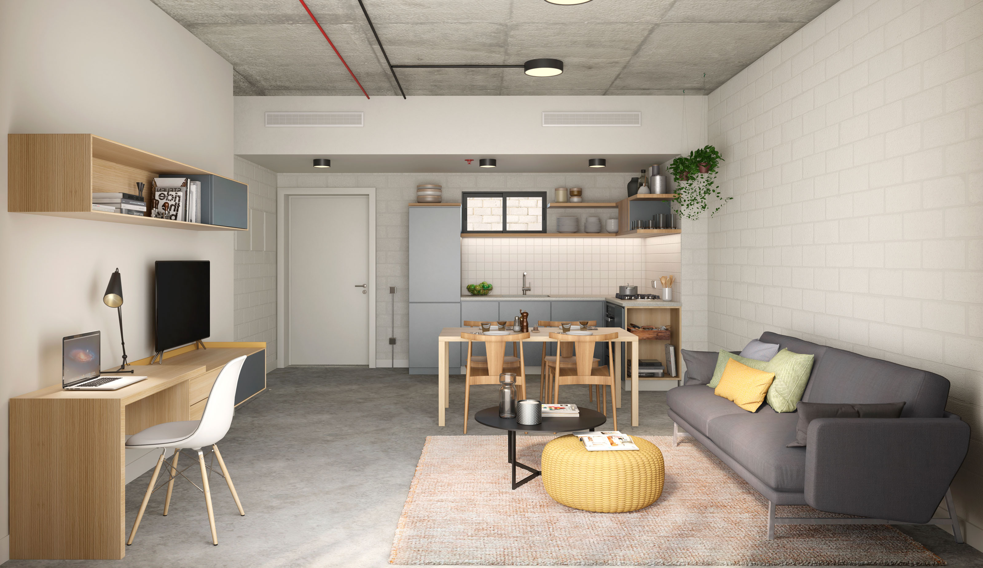 ID main idea is to get the maximum quality of space for an affordable sum. A cost-driven project but allowing for special features and elements that make it special for the tenant and related to an aesthetic in interior design that is inspired by old factories and industrial spaces that have been converted into lofts and living spaces.