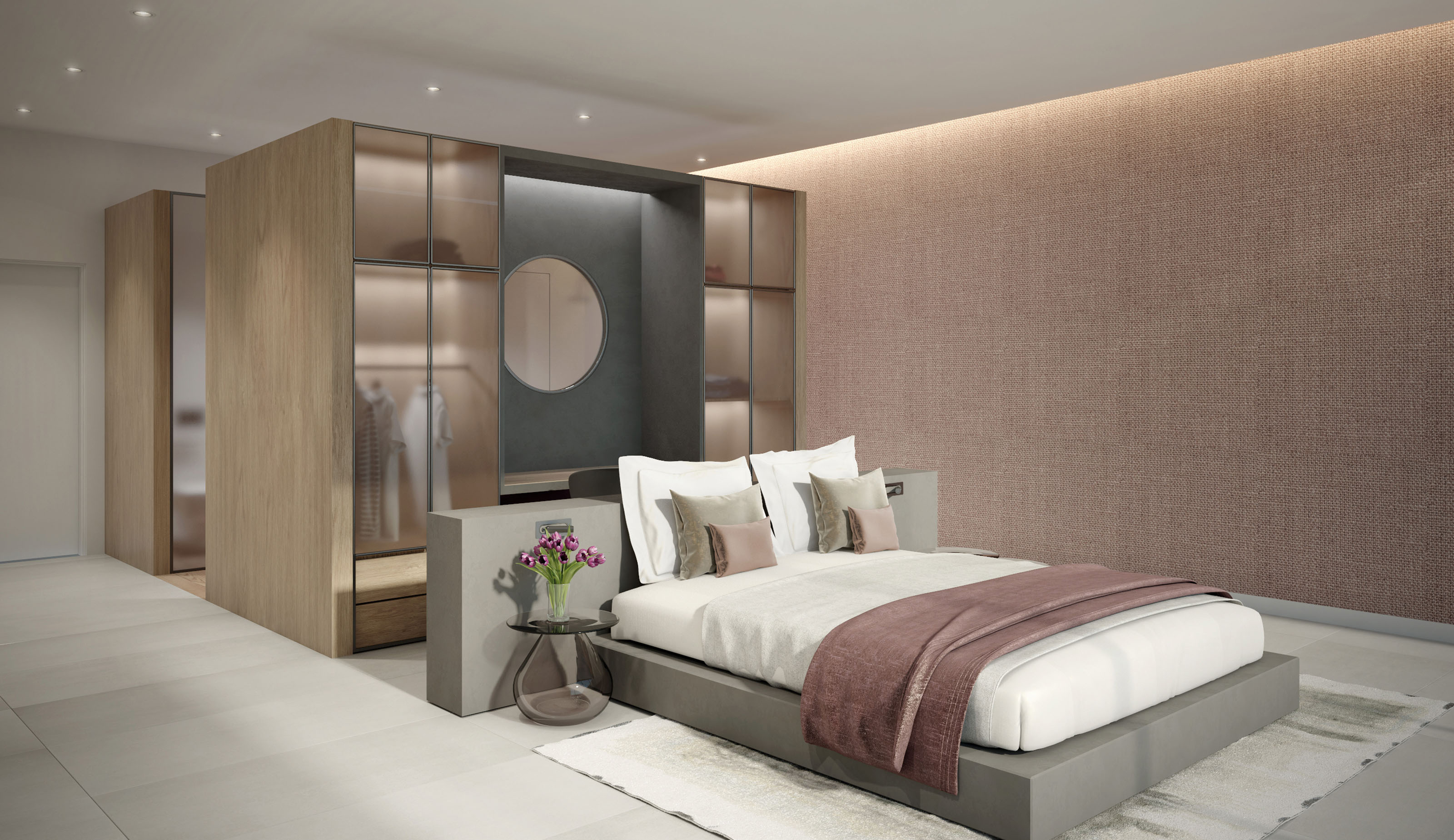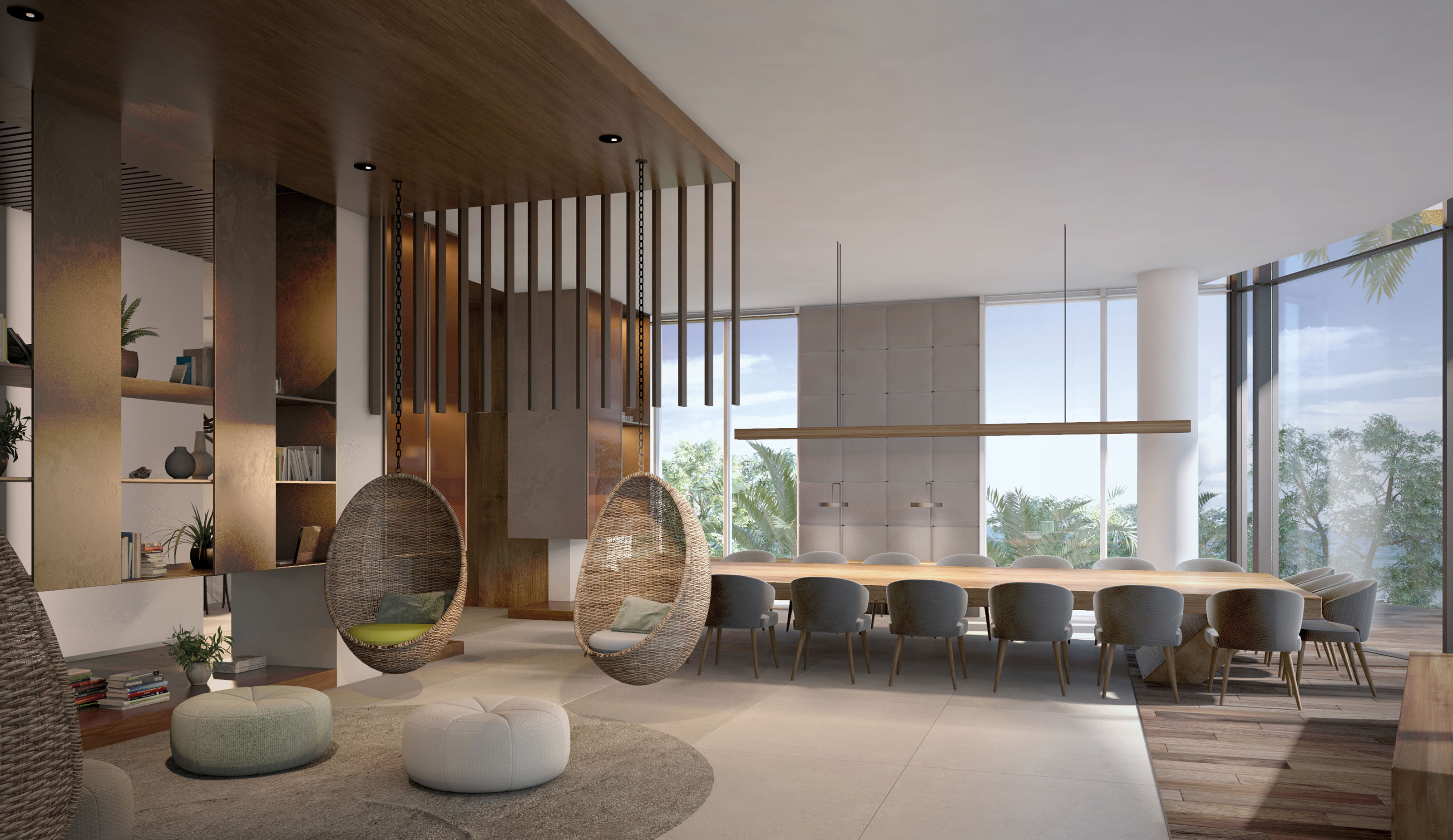 The villa enjoys a privileged location, facing the city’s skyline from the front façade and the sea from the rear side of the building. This is a private house composed of a basement, ground floor, first floor and roof. The interior design concept focuses on the openness of the spaces, dominated by straight lines, and the access of sunlight through the glass walls. This is specially relevant in the living room space, where a series of thin wood partitions create separated atmospheres decorated with locally inspired furniture, lamps and rugs across the large space.