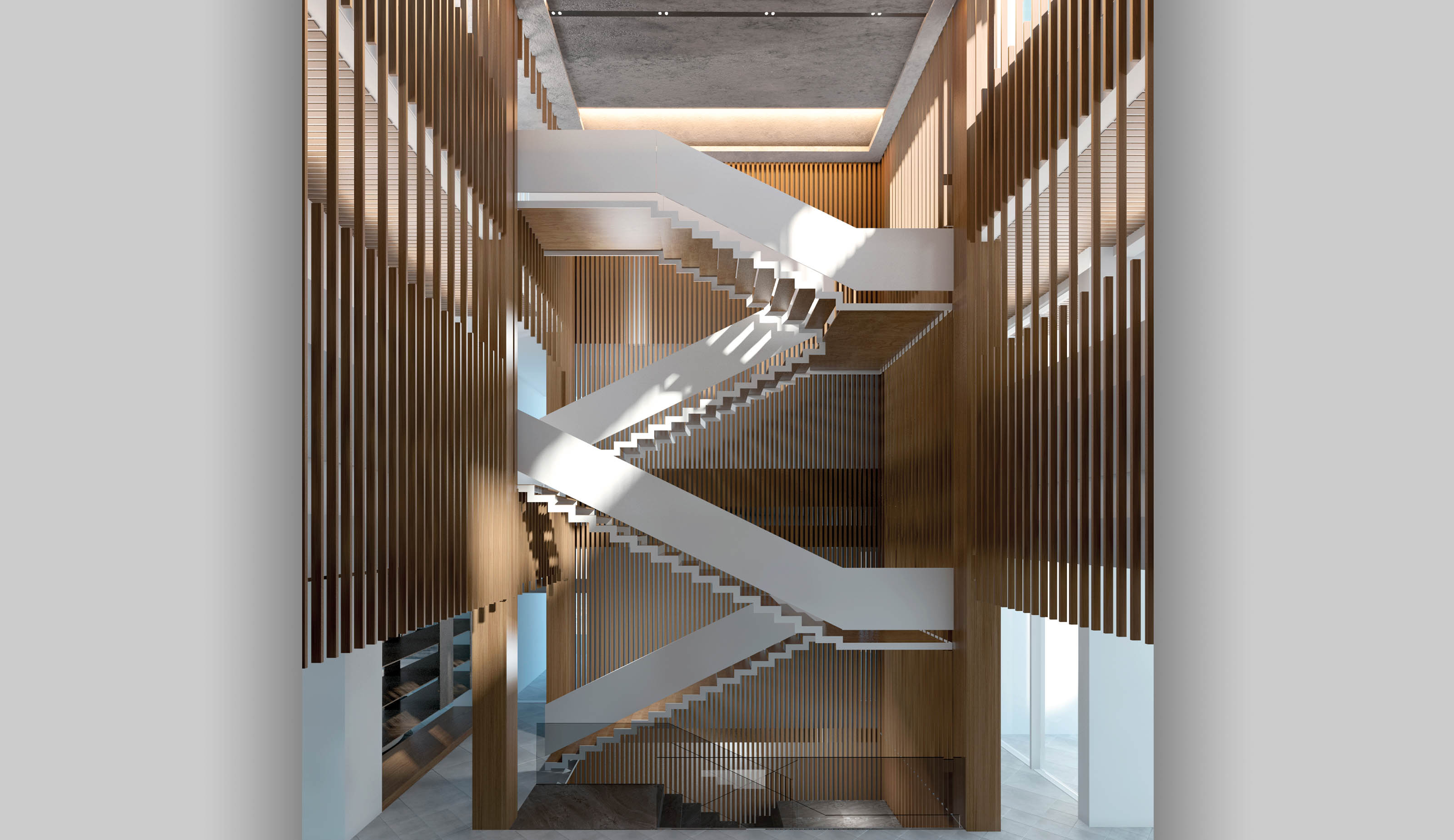 In the centre of the villa we discover a central courtyard where a sculptural and white geometric staircase guides you through all the levels jointly with a lift, both leading the users to a series of intertwined corridors. This link also happens between the front and back entrances to the property, which are connected, meanwhile the back one has access to the nearby beach.