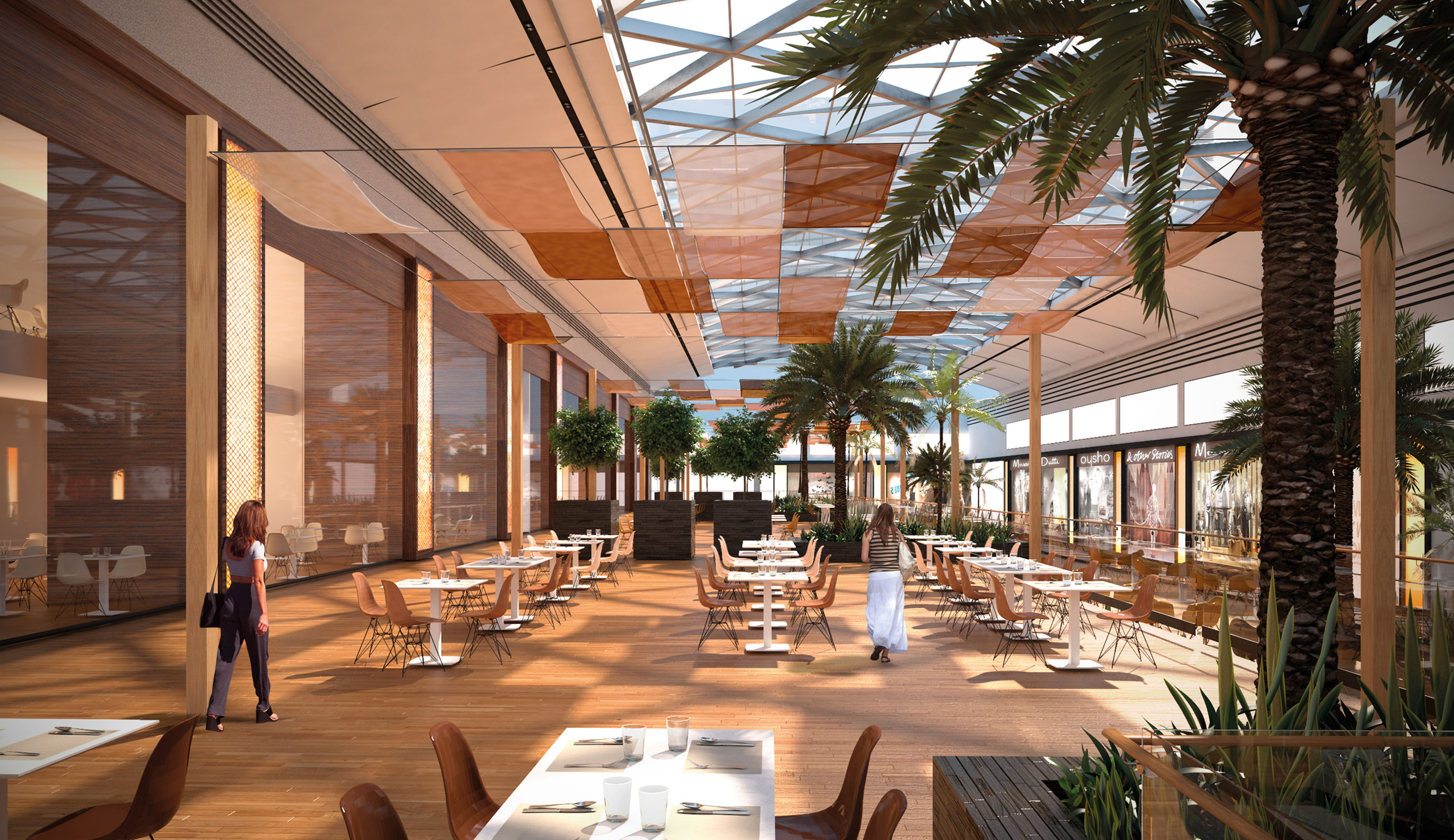 The Transition Zone links both developments. This bridge welcomes and guides visitors to the new expansion and has the same spirit as the existing mall. A warm and dynamic atmosphere is achieved, with inspirational elements like the desert references present in the fine dining area which provide a cozy space by combining warm textures, palm tree shapes and a touch of bright colors with natural light coming from the roof skylight.