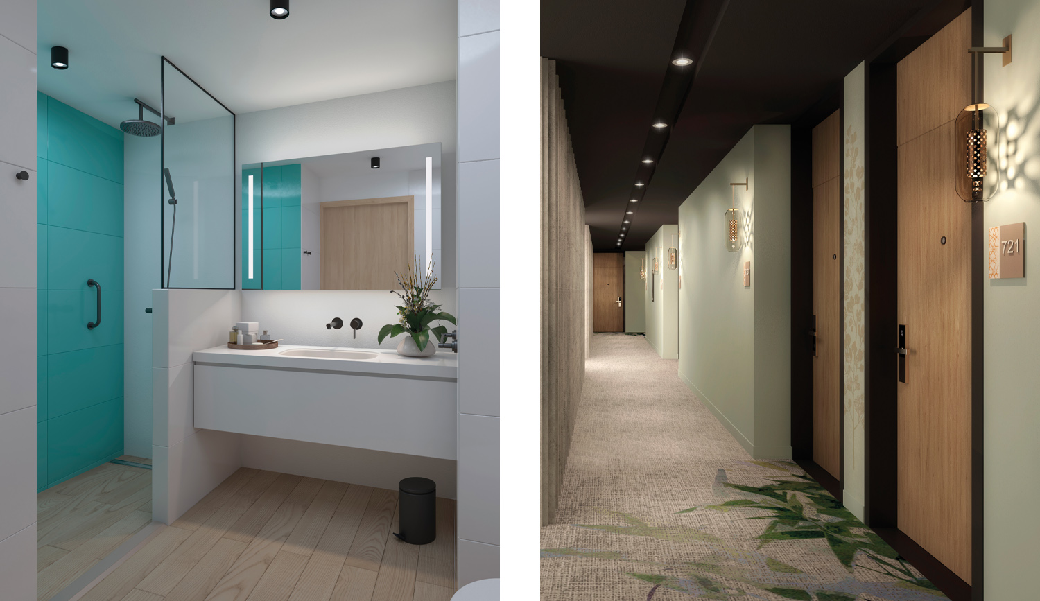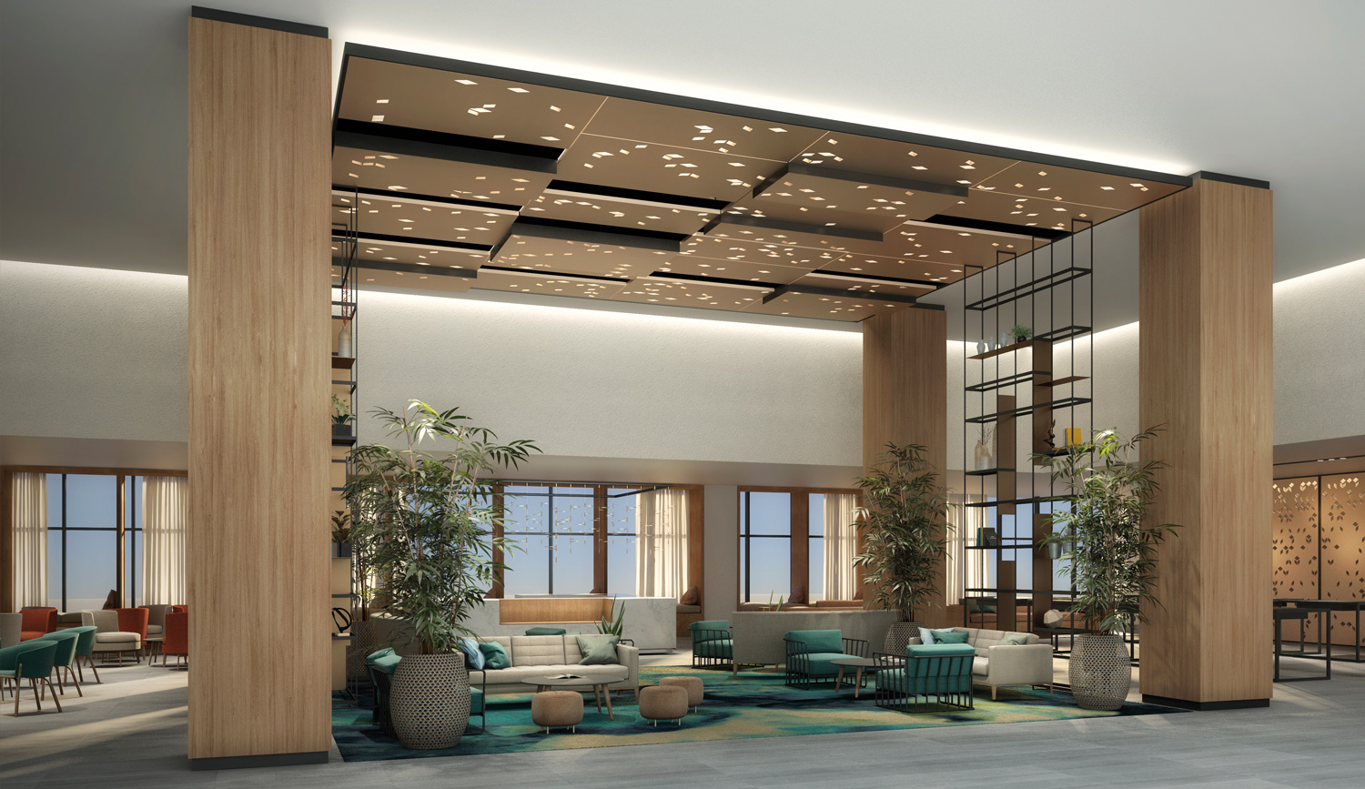 Main lobby is inspired by framed spaces that interact with each other, allowing that the open concept hotel to take place. When entering the lobby, vertical elements and feature walls welcomes the guests. Earth color palette, that vary from green to blue green, and accents in dark grey or light copper tone. Greenery as ornament elements are present to living room atmosphere. Frames elements give niche corners and privacy to the open space and they create comfortable and pleasant experiences for the guests.