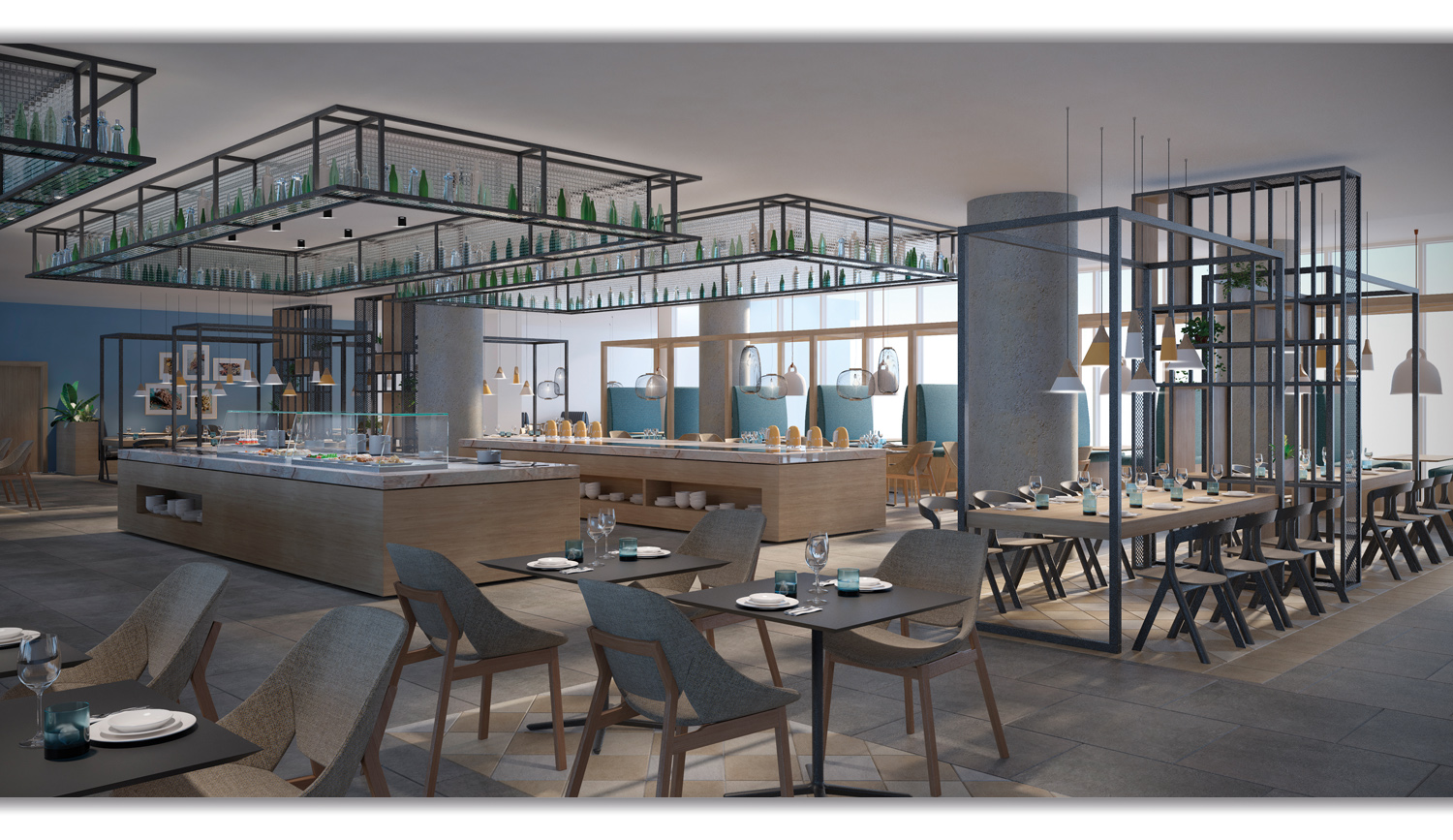 The All day Dining maintains the overall idea, such as linear and clean surfaces with an interactive and open plan for a better circulation. Variety of seating zones types offers flexibility. Additionally the use of batten panels and green walls creates a warm and elegant atmosphere and also provides an acoustic comfort in an ADD with large dimensions.