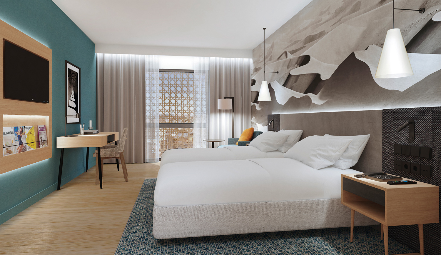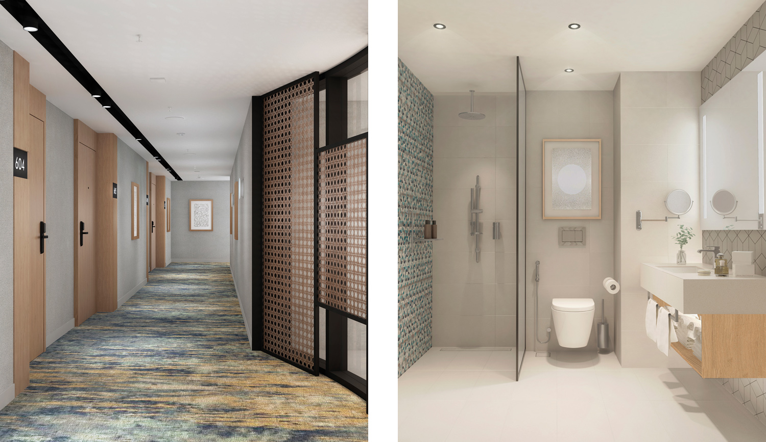 The main lobby is a welcoming, sophisticated zone. Grey tones and accent colors create an elegant ambience. Metallic lamps, wooden slats and solid material as marble and concrete are combined together.