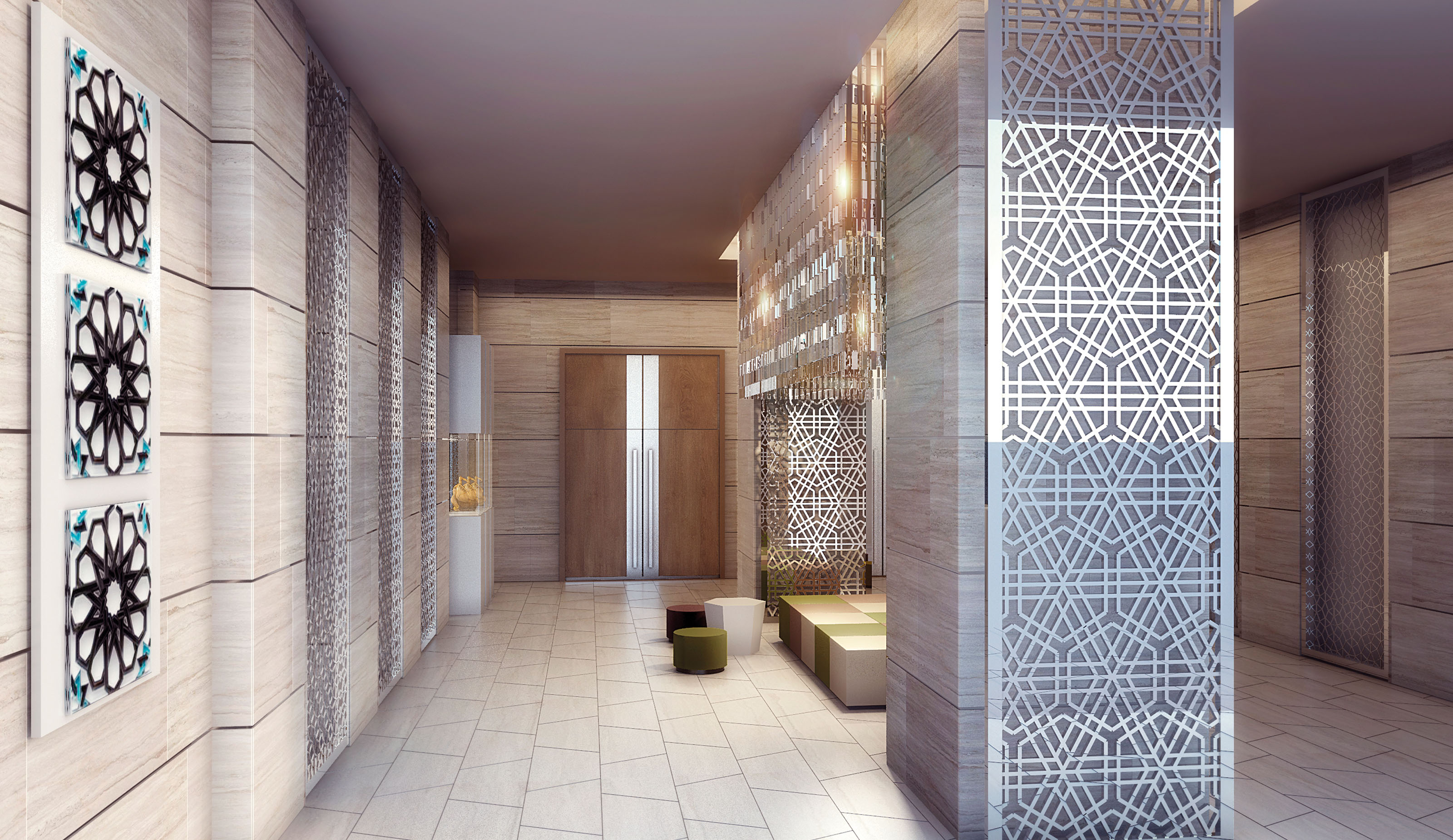This idea is materialized by emphasizing wide spaces which also manage to provide a degree of intimacy for the guests by strategically placing furniture and decorative structures built in natural materials such as wood, achieving the desired level of discretion. In the rooms and apartments, a more neutral yet equally distinctive approach is taken, with a continuity in terms of materials yet highlighting a relaxed atmosphere through the use of furniture, textures, decorative elements and a neutral and fresh color palette. The program also includes the interior design of all FOH areas: main lobby, cafeteria, ADD, prayer rooms, business area, ballroom and pre function area, gym and spa, and 120 residence inn apartments units.