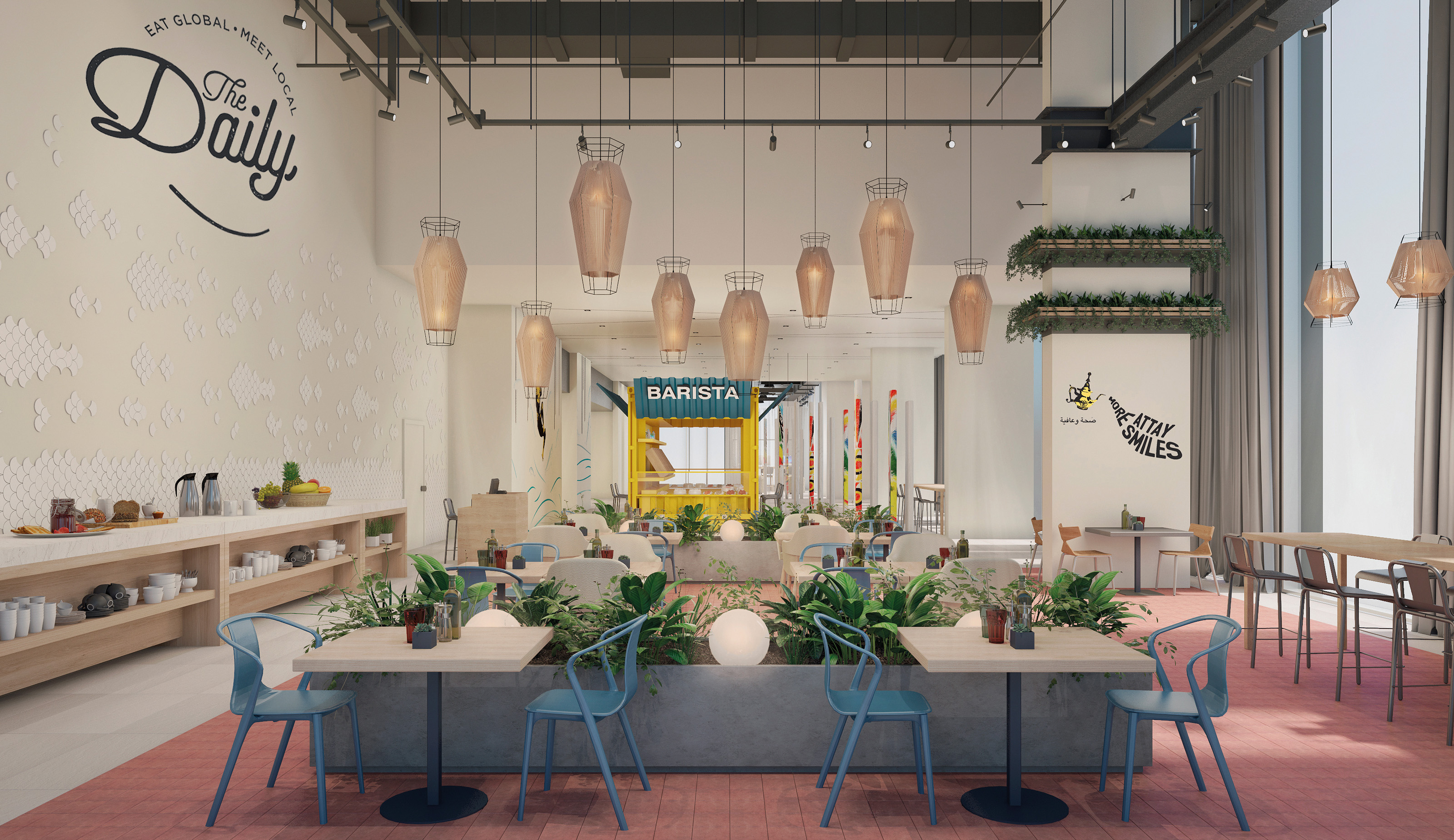 The interior Design takes a contemporary approach with minimal lines, using materials that are glimpses to the Nouakchott port activity and local cultural accents, merging the old heritage with the newer industrial and modern era.