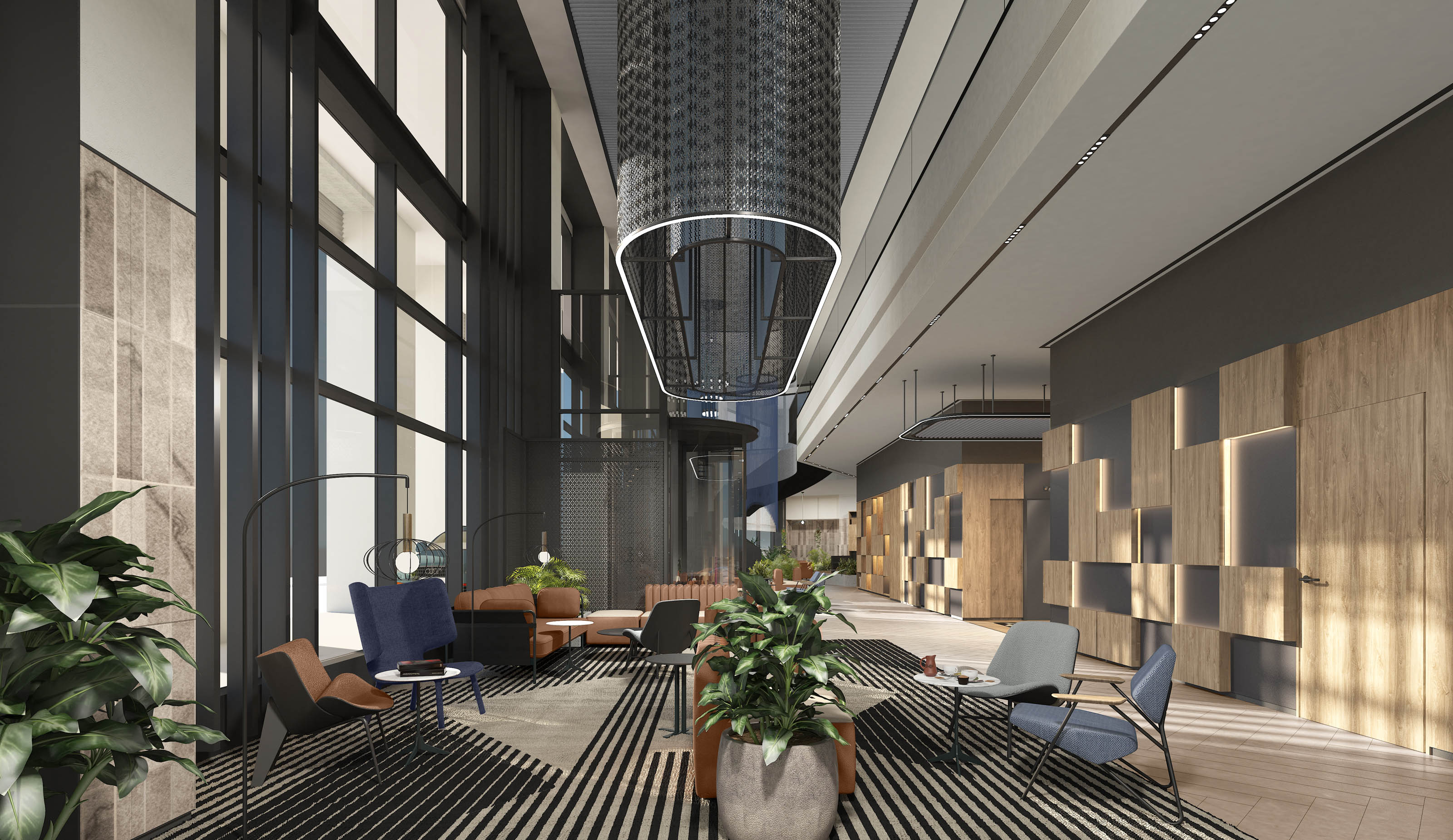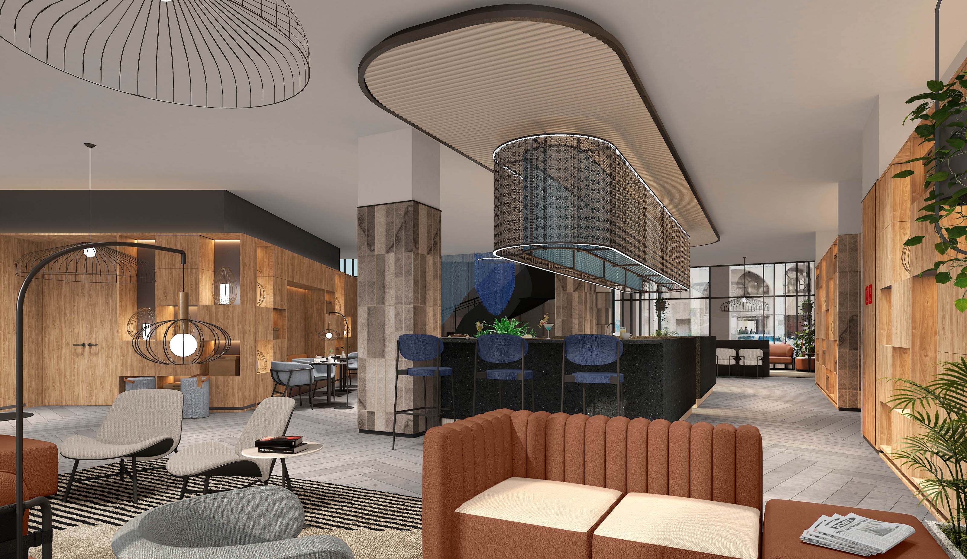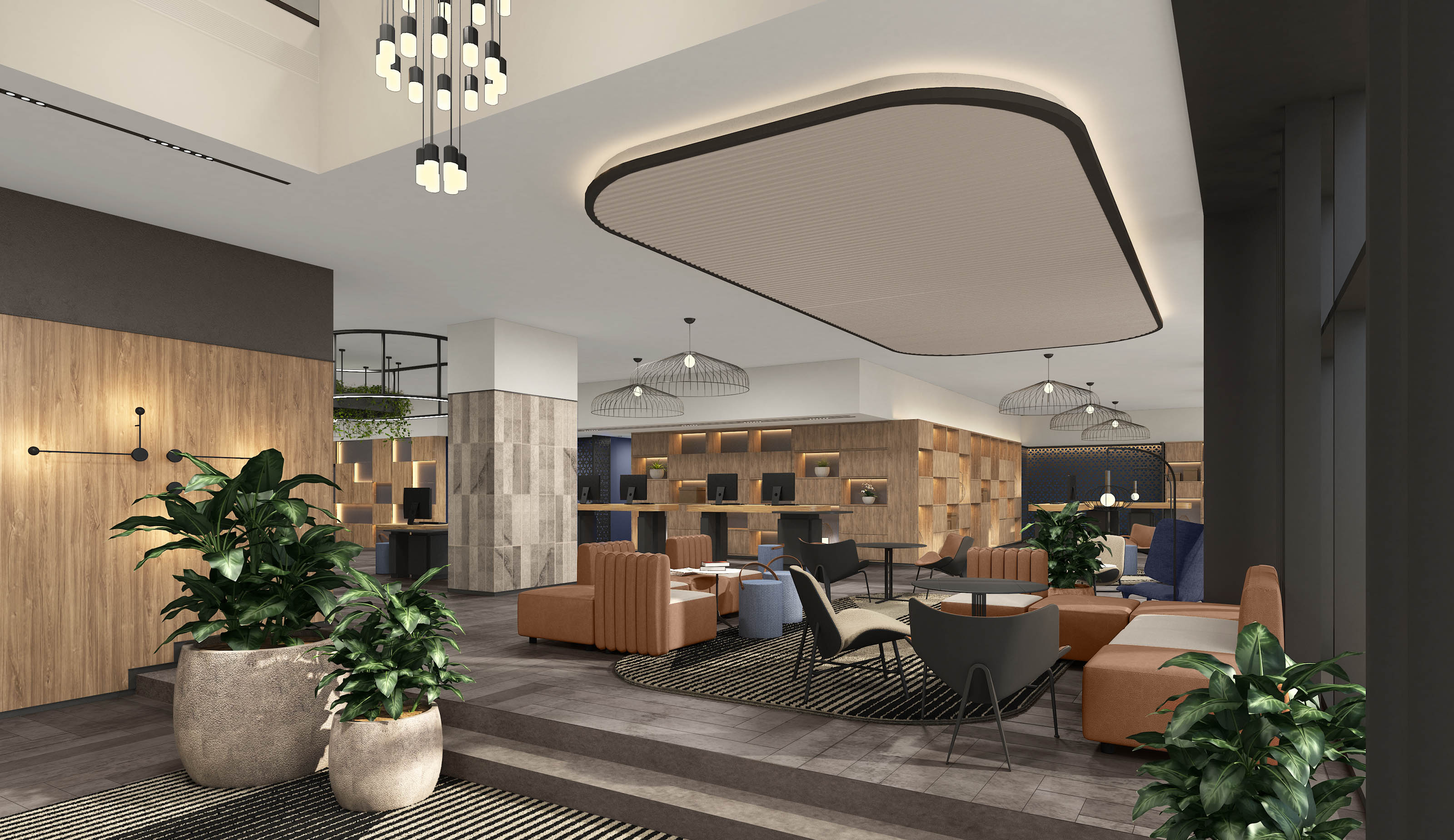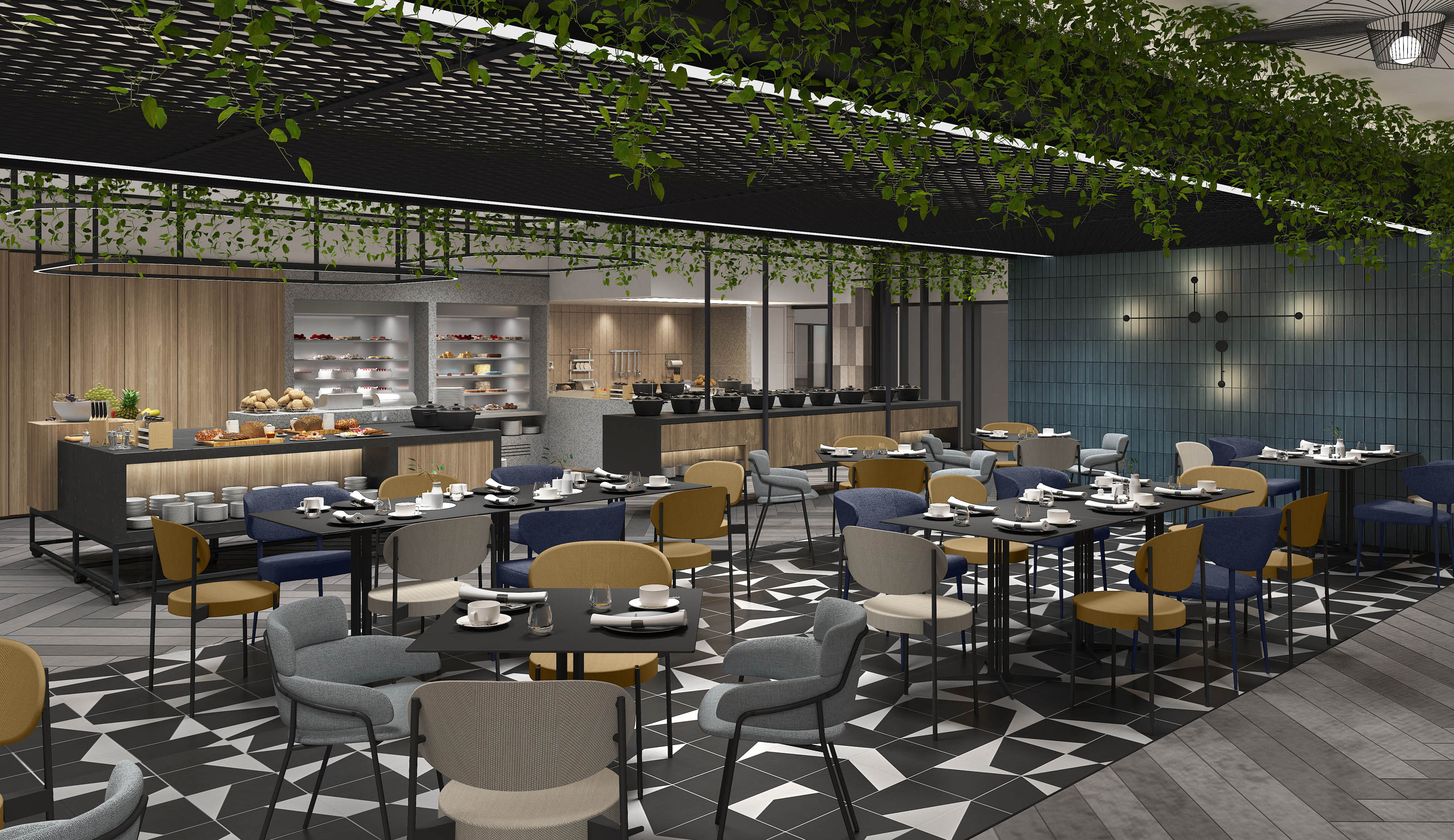The design proposal is based on combining extensive areas of color with delicate black profiles. This “framing” effect is also achieved with light profiles that divide the different spaces within the same room or frame a particularity within the space such as the buffets within the ADD or a specific sofa area within the informal meeting. The combination of the natural texture of the wood with the geometric patterns coming from the tiles or the patterns on the carpets give this feeling of modern warmth. Along with comfort and an elegant and personalized atmosphere, the interior design highlights the idea of providing guests with a new standard of high-end accommodation.