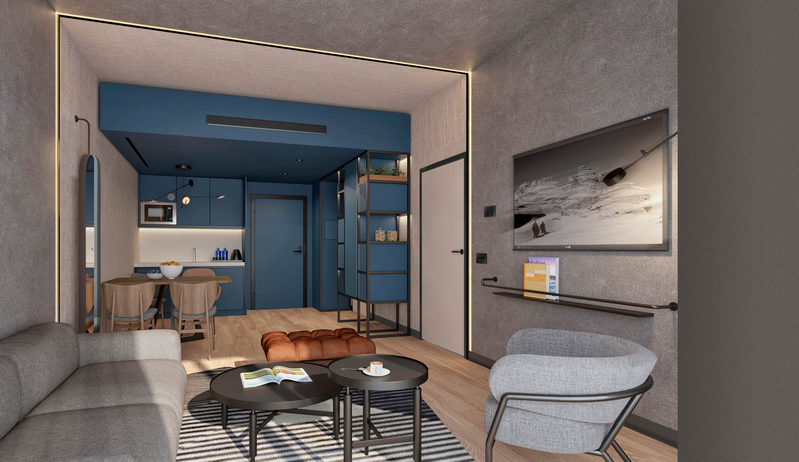 The design code focuses on providing a modern look and stylish atmosphere without sacrificing warmth. It strongly highlights a key element that is common to all spaces: color. The combination of the selected palette used in all rooms, apartments and public areas serves to achieve a dynamic design and a calm environment.