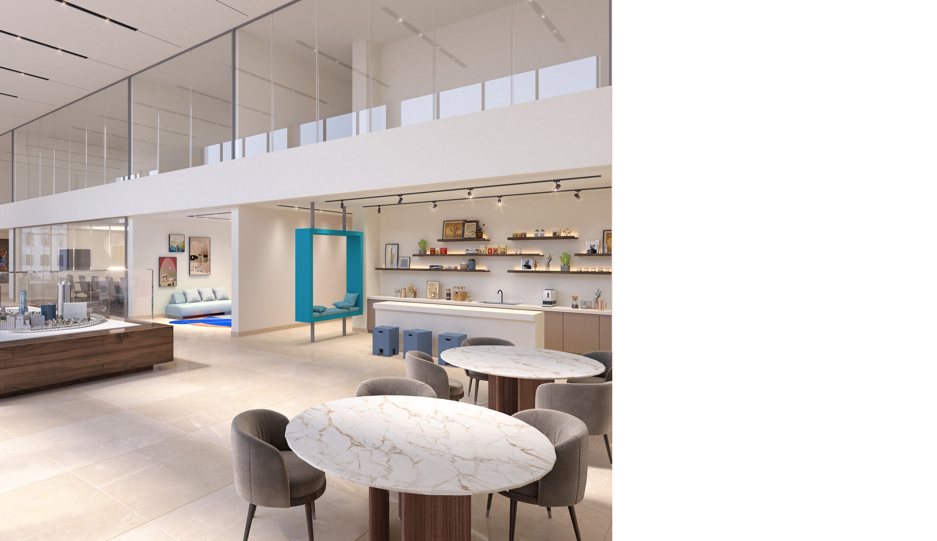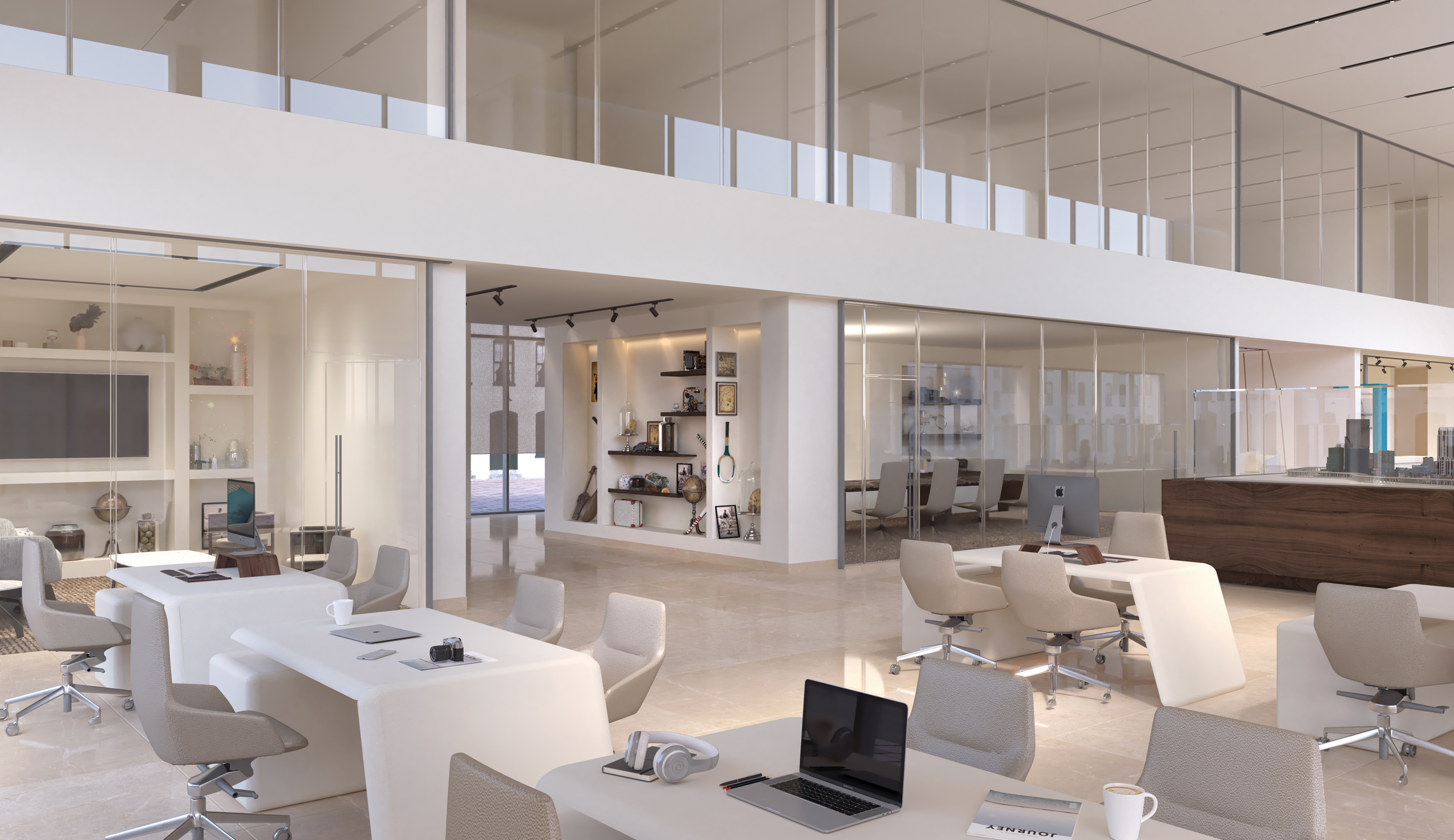 A contemporary showroom that seamlessly blends modern design with echoes of Jeddah’s traditional architecture. The offices exude sophistication with a serene palette reminiscent of the city’s sandy tones, adorned with wooden accents reminiscent of mashrabiyas. Carefully chosen furnishings, upholstered in warm Arabian sand tones, invite guests to relax in comfort.